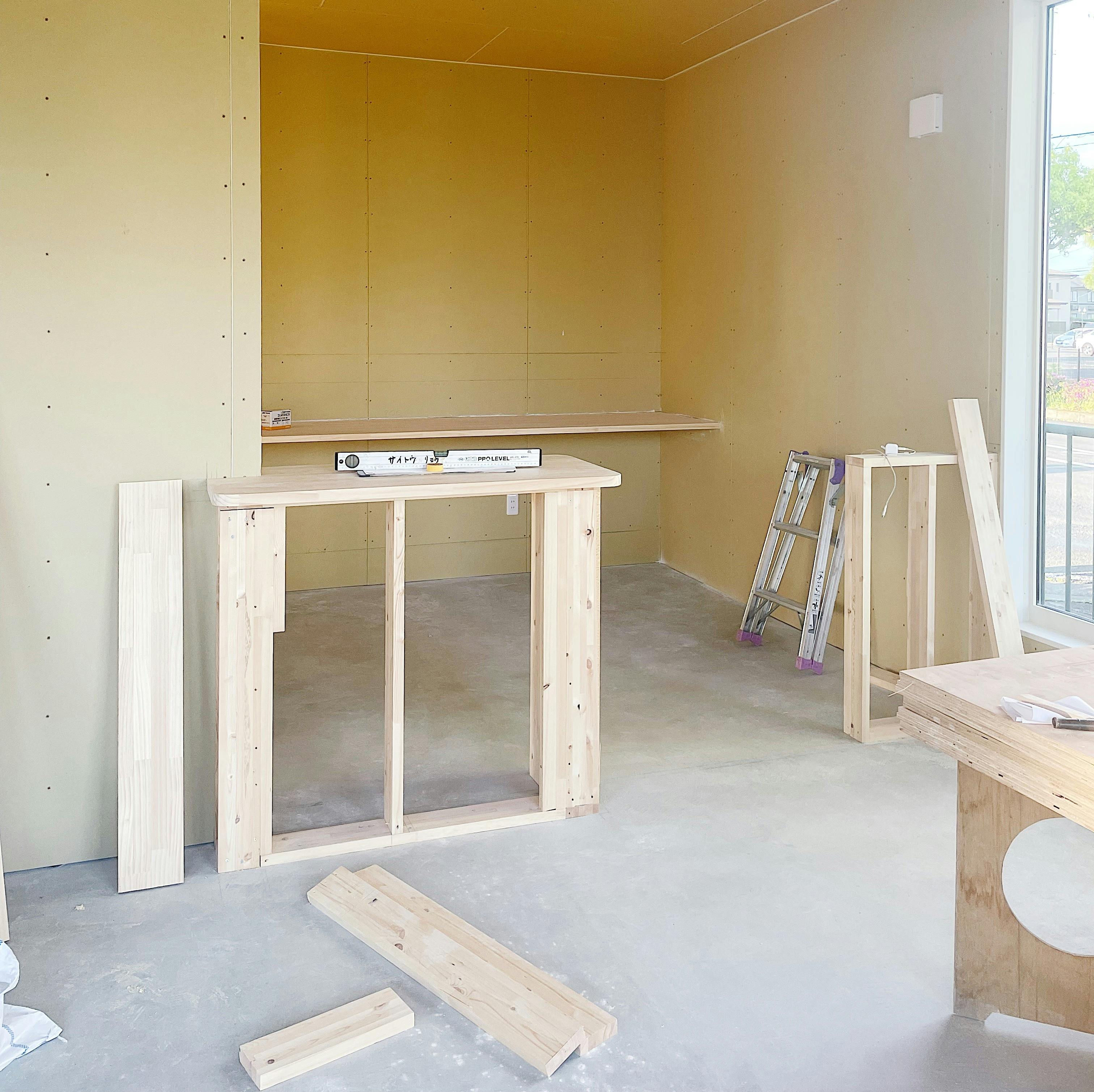 cafe CREMAのテナントは新築のため本当になにもないスケルトン物件でした。4月下旬に内装工事が始まりキッチンとの仕切り壁、レジカウンター、ドリンクカウンターが着々と完成しました!配置や形、色など私の理想のお店により近づくように作っていただきました!噂には聞いてましたがスケルトンは内装費が高額……なんとか費用を抑えられないかとホールの壁は自分たちで塗ることに!笑パテ塗りも壁塗りもしたことないけどYouTubeで職人さんの動画を見漁って楽しそう!自分のお店だし1箇所くらいDIYもいいかも!なんてやる気十分 ⚑︎⚐家族総出で壁塗りの日々が始まりました。壁塗りの様子はまた次回投稿します! もっと見る