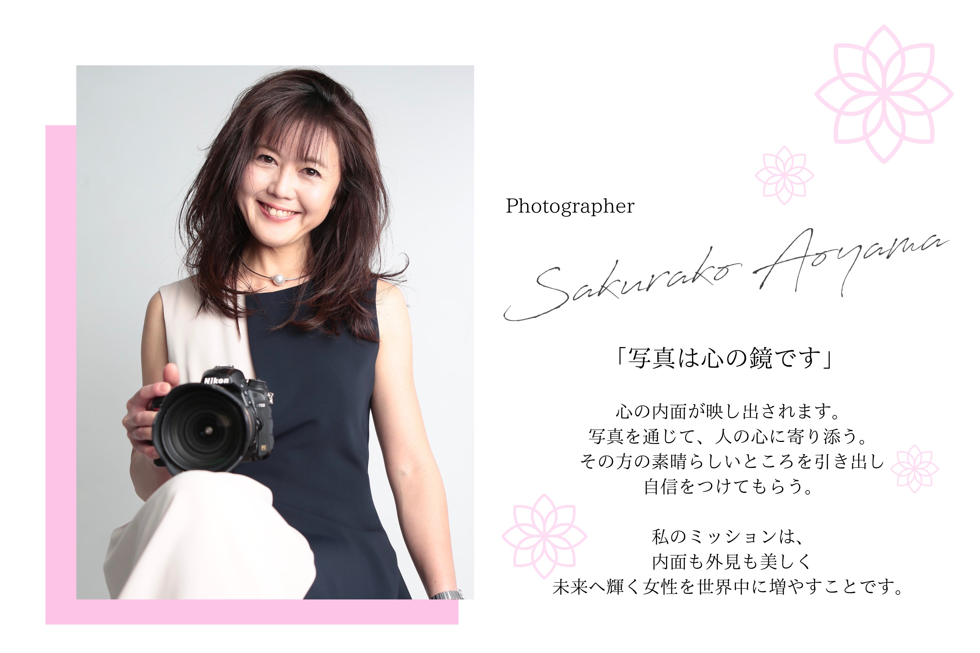 「写真は心の鏡」です。写真を通じて人の心に寄り添い、内面も外見も輝く女性を世界中に増やす。