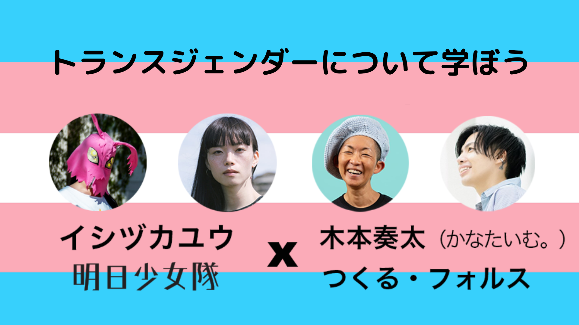 メインの90分の対談にはトランスj当事者でファッションモデルのイシヅカユウさん、YouTuber(かなたいむ。)の木本奏太さん、ロサンゼルスからは全米トランス・ライツ・アクション・デイ発起人のつくる・フォルスさんをお招きしております。イントロのレクチャーでは、明日少女隊からトランスジェンダーとは何かについてわかりやすくお話しします。