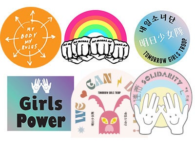 左上からMy Body My Rules、No Means No、明日少女隊、左下からGirls Power、We Can Do It! 、連帯のステッカーになります。1つのステッカーは2.5~4.5cmで、スマホケースに複数貼れるようなデザインとなっています。個展会場にて定価九百円で販売予定の商品なので、こちらで購入されるとお得です。