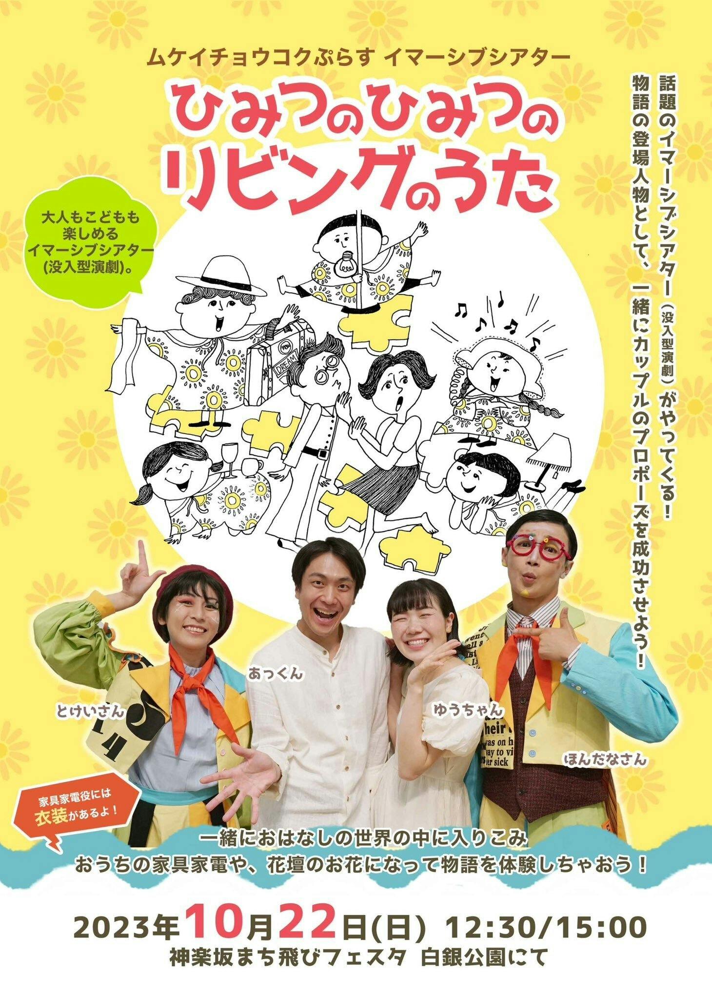 2023/10/01 09:02皆様からお寄せいただきました熱い熱い応援のおかげで、『ひみつのひみつのリビングのうた』次回公演が決定いたしました!10/22(日)神楽坂まち飛びフェスタ@白銀公演にて上演いたします⭐︎特設サイトはこちらトライアル公演のときには、ご予約時にお選びいただいていた【家具家電】と【花壇のお花】の参加方法を、今回公演では当日ランダムに振分けるスタイルに!トライアル公演での【家具家電参加】は《お子様&お子様とご一緒の大人》限定でしたので、今回は大人の皆様もどなたでも、子どもたちと一緒にプロポーズを応援していただけます(o>ω<o)さらに!お祭り会場での上演ということで、今回はちんどん屋さんキャストも登場します⭐︎この作品も、まち飛びフェスタも、ワクワクいっぱいに盛り上げますよ〜((o(*>ω<*)o))トライアル公演での様子登場人物として物語を体験するムケイチョウコクのイマーシブシアター、 この『ひみつのひみつのリビングのうた』は、赤ちゃんからおじいちゃんおばあちゃんまで、みんなで楽しむことのできる作品です。今回は公園での上演となるので、お散歩気分でご参加いただけますよ(^○^)トライアル公演の上演風景小学生以上のお子様から参加できる【家具家電役】では、ひとりひとりが可愛い衣装を身につけ、カップルを応援するお家の家具や家電の役として物語に参加していきます。やる気満々さんも恥ずかしがり屋さんも、みんなそれぞれの個性のまま、自分だけの物語のなかで、もしかしたら見たことのない我が子やママやパパやお友達の姿を、新しい自分を、見つけるかもしれません。家具家電役での参加者たち赤ちゃんからご参加できる【花壇のお花役】では、お家の周りの花壇の席で、お花を手に、お花になって物語を見守ります。声を上げて笑っちゃってももちろん良いし、応援もできます。泣いちゃったり飽きちゃったり、そんな時はそっと席を離れて良いし、またいつでも戻ってきて大丈夫。「役になるのは恥ずかしいから観てるだけ」も、もちろん大歓迎です。花壇のお花役での参加者たちトライアル公演にご参加くださった皆様には、ぜひまた違う役にもなってみてほしいし、まだ参加されたことのない方には、もうもうぜひぜひ!この作品を体験してほしい!その日その場で集まったばかりのメンバーだなんて信じられないくらい、素敵な愛おしい物語ができあがるのです。活き活きと物語に生きるみんなの真実が、きっとあなたの一日を優しく豊かなものにしてくれるはず。皆様のご参加を、心からお待ちしています♪ご予約お申込はこちら神楽坂まち飛びフェスタ公演『ひみつのひみつのリビングのうた』【日時】2023年10月22日(日) 12:30/15:00※屋外のため雨天中止【場所】新宿区立 白銀公園〒162-0816 東京都新宿区白銀町3 東京メトロ東西線神楽坂駅:徒歩3分 都営大江戸線牛込神楽坂駅:徒歩5分【チケット】 大人一般:1,500円 こども一般(小中学生):1,500円 親子ペア(大人1名+小中学1名):2,500円★Special チケット(テーマソング2曲がダウンロードできるポストカード付き)★ 大人Special:2,500円 こどもSpecial(小中学生):2,500円 親子ペアSpecial(大人1名+小中学1名):3,500円 未就学児:無料 (保護者様とご一緒に花壇のお花役になります)【ご予約】お申込はこちら【当日券】前売りチケット完売後も、毎公演ご用意します!公演当日の11時半〜15時までの間に、公園内の受付にてお求めください。先着販売、売り切れ次第販売終了いたします。<CAST>AGATA 生田麻里菜金子しんぺい 塚越光〜ちんどん屋さんキャスト〜宇都有里紗/中島早紀/永峰光彩季/星野李奈松浦志帆/羽香夏/わたなべゆうた/渡邉理衣<STAFF>◆ムケイチョウコクスタッフ 今井夢子(構成) 美木マサオ(ムーブメント) 内山智絵(アクティング指導) 野元綾希子(制作) 奥村そら(ライター)衣装 鶴岡寛恵 音楽 annasekai道具 磯和武明演出 ムケイチョウコク&all cast もっと見る