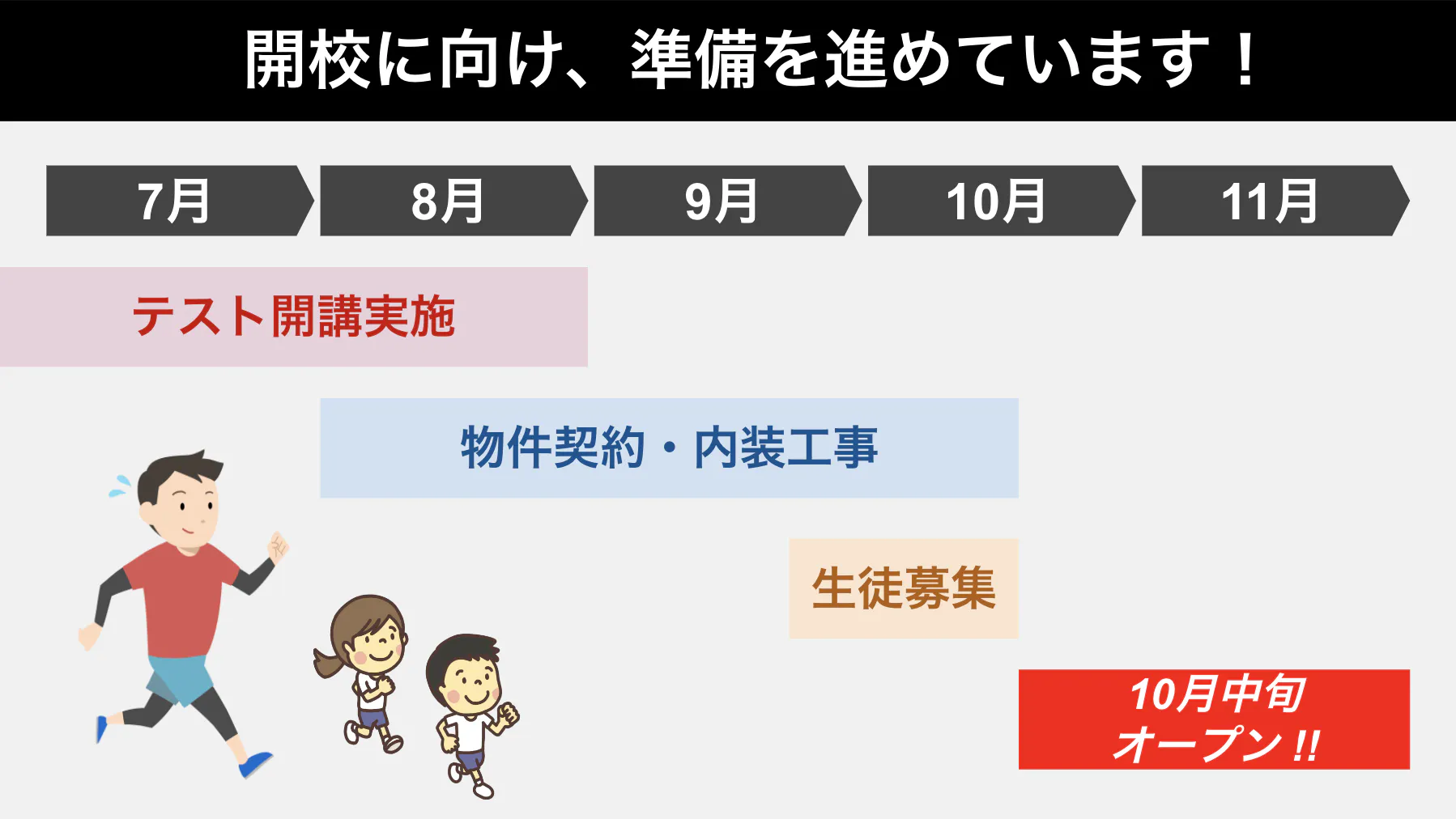 下記のスケジュールで、「ジロジム」開校に向けた準備を進めております。