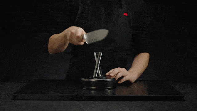 食材を切るように包丁を動かすとロッドが左右に動き、設定された角度に包丁を研ぎあげます。砥石と違い包丁を横に倒して研ぐわけではないので気軽に省スペースで最適な刃の研ぎ上がりを実現します。