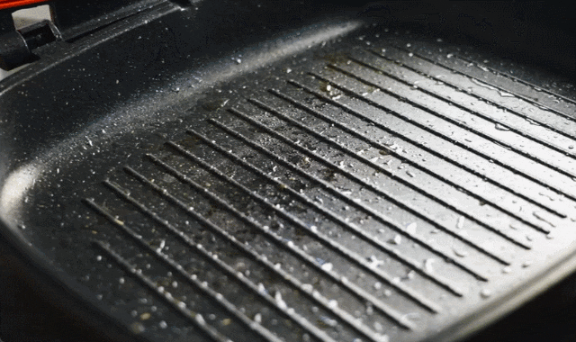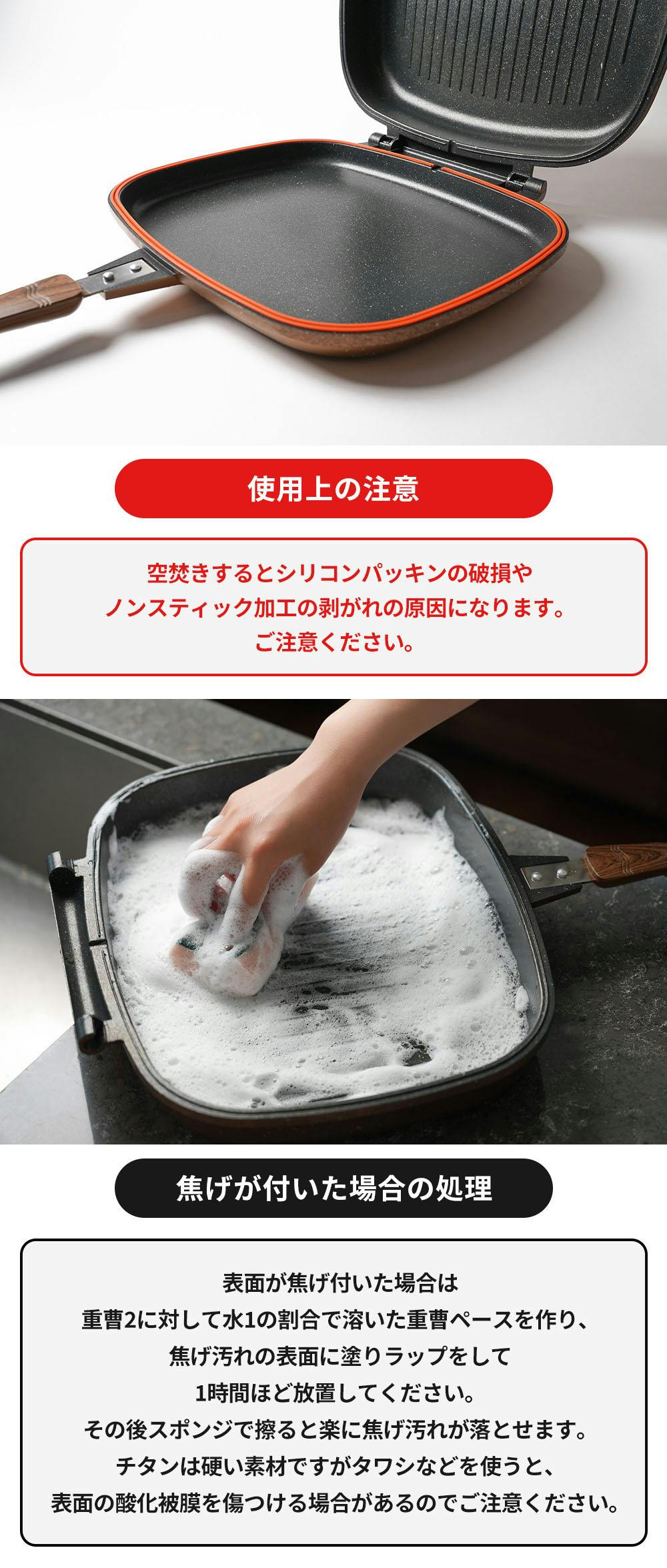 【DOUBLE GRILL】の外側は丈夫で錆びにくいチタンコーティング、内側は焦げ付きにくく油汚れも付きにくいマーブルコートなので使用後のお手入れも簡単です。