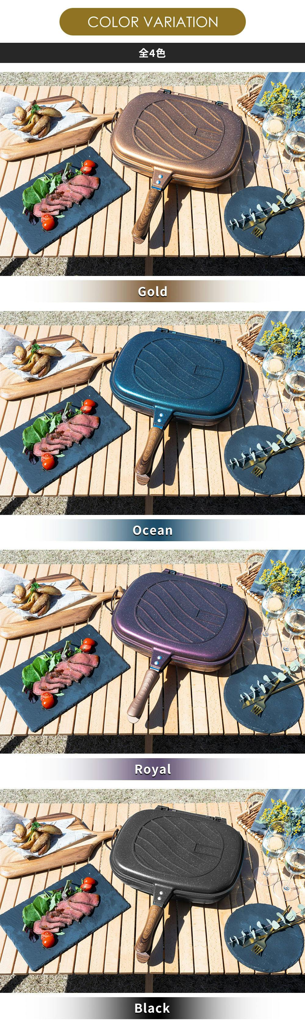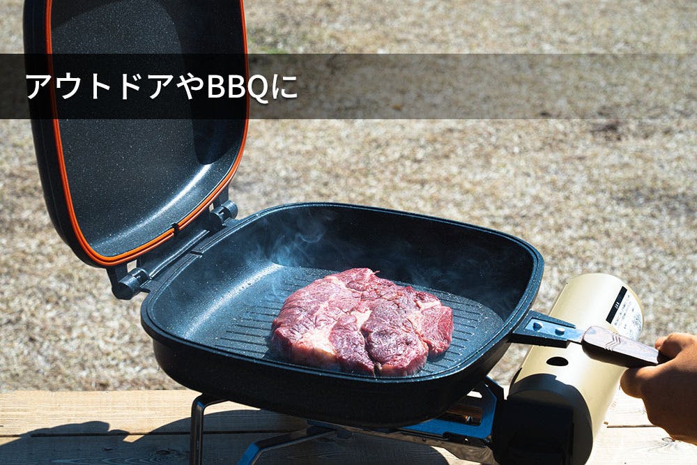【DOUBLE GRILL】は弱い火力でも素早く調理ができるチタンコーティングのダブルパンです。