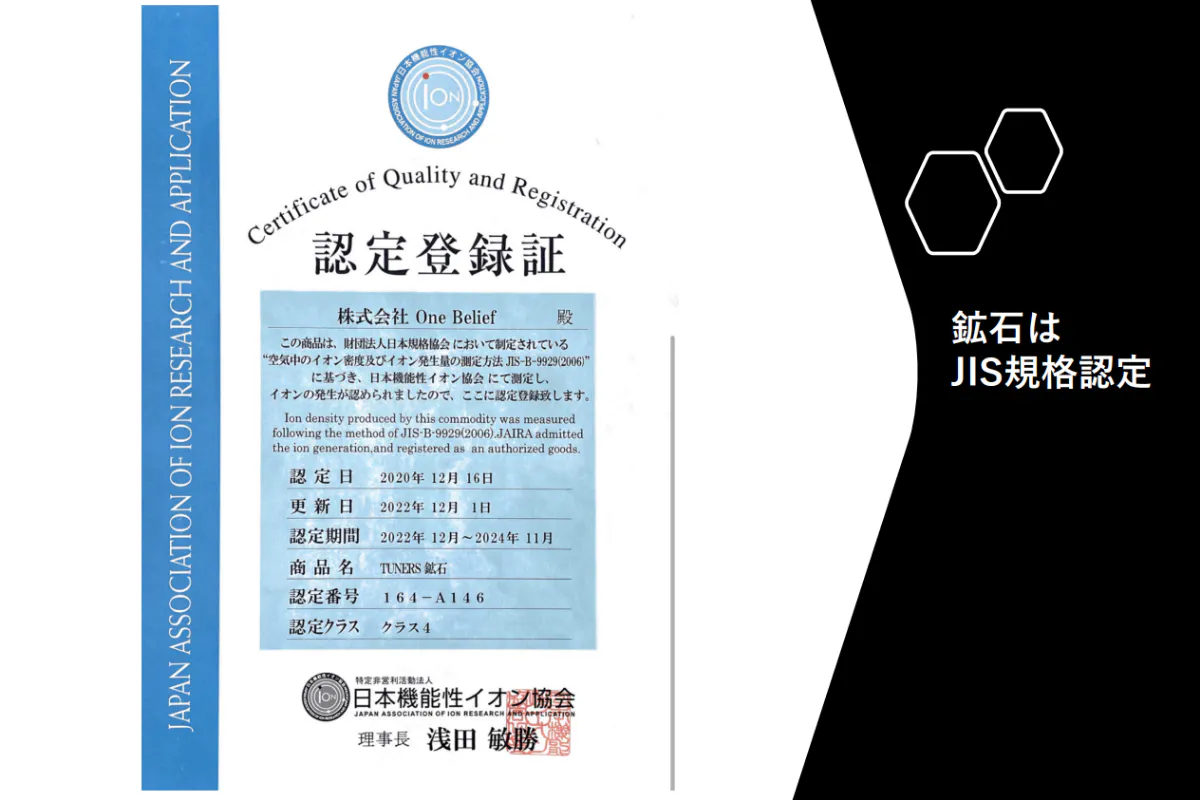 当製品に使われる鉱石は、JIS規格の厳しい審査にも合格し、マイナスイオンが発生することが実証されています。