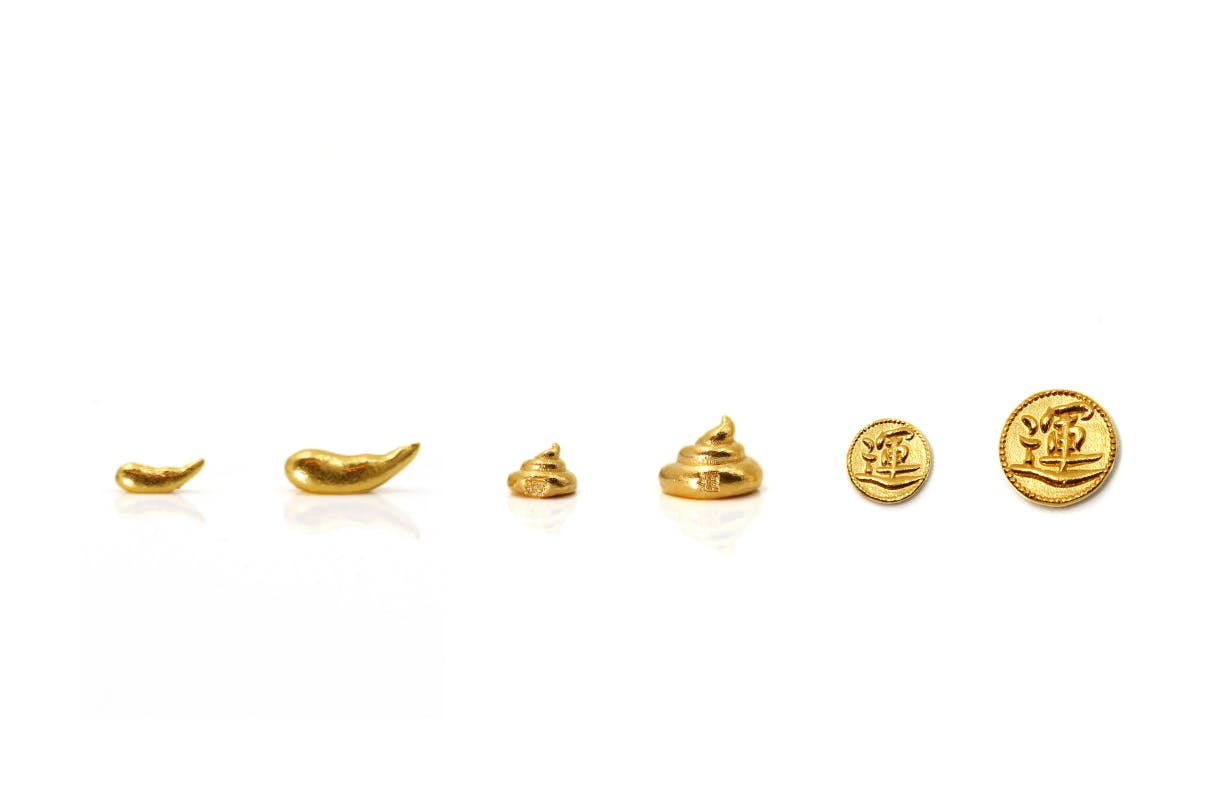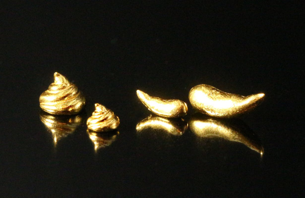 画像左から 巻き運(大)(小)、バナナ運 (小)(大) 、いずれも K24純金製。