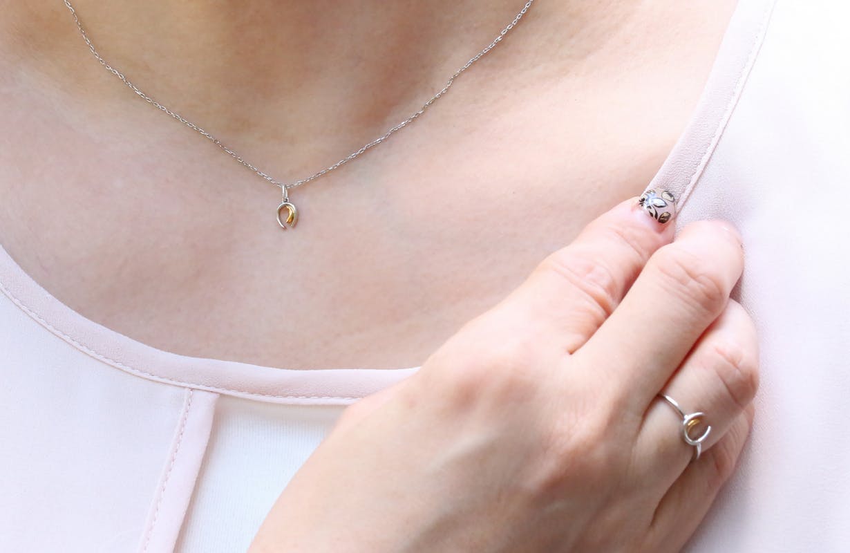 純度99.9%の金「純金の運幸」をアクセントにしたリングとペンダント。