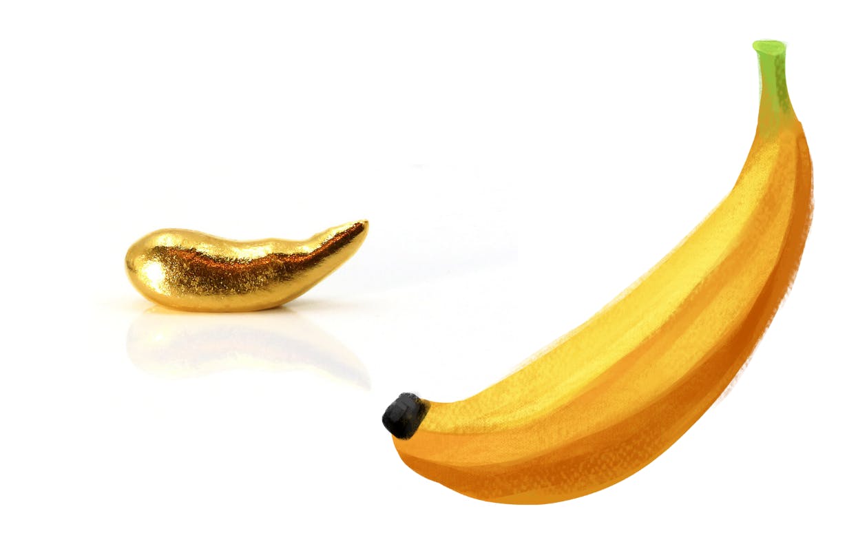 バナナ運黄金色に輝く、バナナ型の純金の運幸。