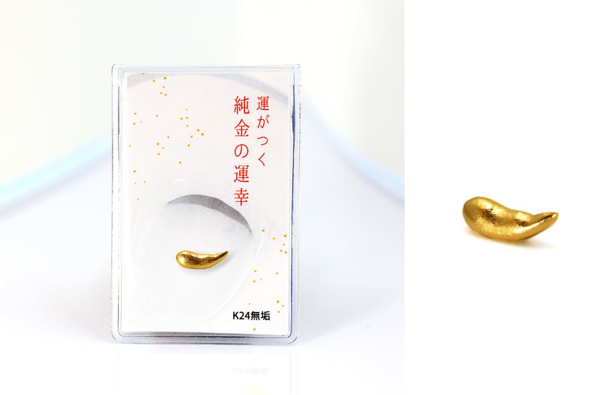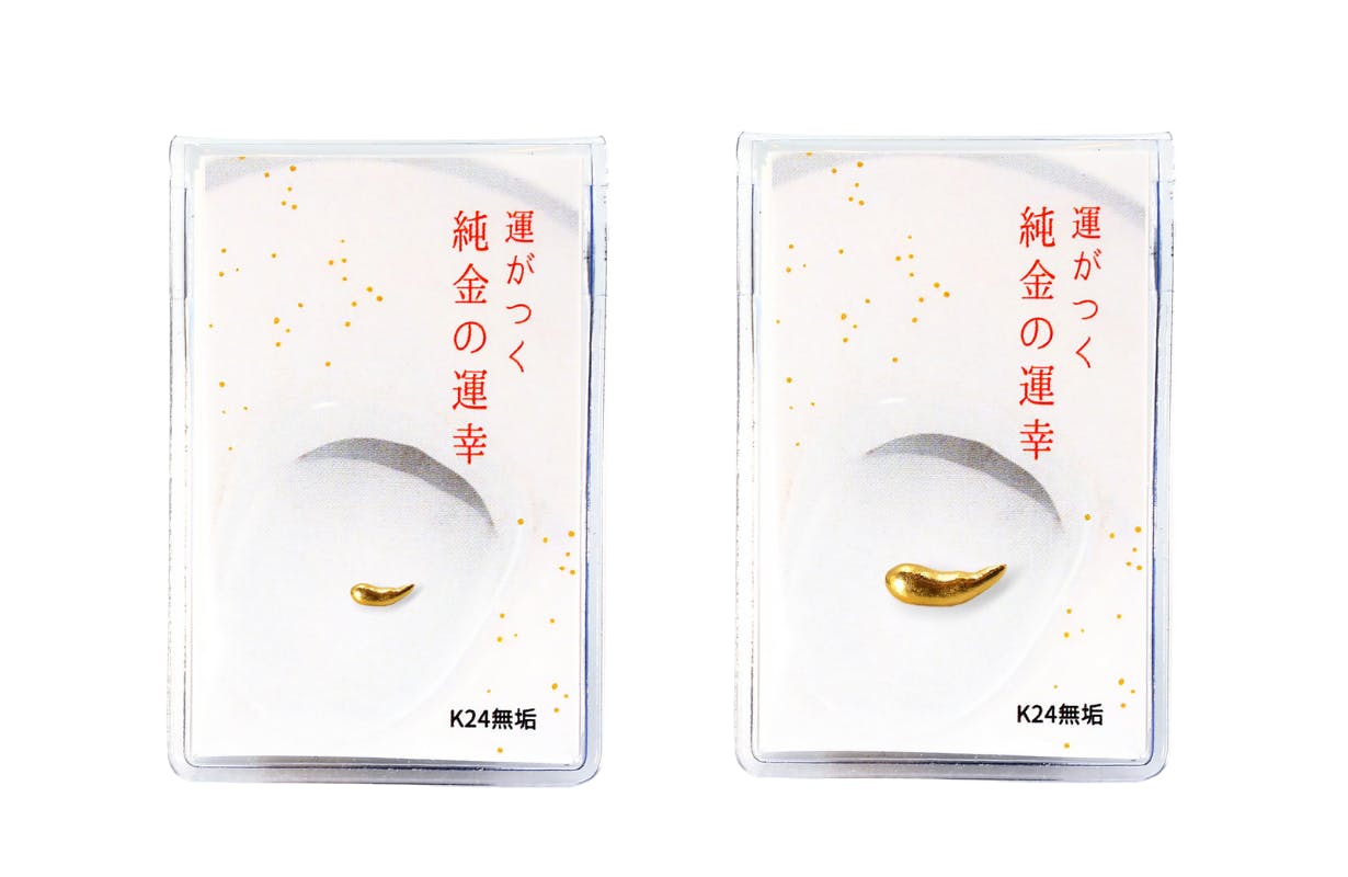 メッキでも中空でもない、無垢な純金。お守りケースに入った純金の運幸。