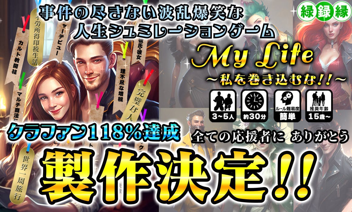 2023/08/07 01:20応援してくれた全て皆様へこの度、8月6日をもって『My life ~私を巻き込むな‼~』のクラウドファンディングプロジェクトが無事に目標金額達成して終了しました事をご報告申し上げます。皆様のご支援、ご協力、そして温かい応援のおかげで、目標を達成することができました。ありがとうございました!プロジェクトの途中で多くの挫折がありましたが、皆様の応援とサポートが私を励まし、前進させる力となりました。『My life ~私を巻き込むな‼~』は、これから印刷用のデータを作成して入稿に向けた作業に入ります。皆様が期待する素晴らしいゲームをお届けするため、全力を尽くして取り組んでまいります。プロジェクトの進捗や開発の様子などを定期的に報告し、皆様と共有していきますので、どうぞ楽しみにお待ちください。また、支援者の皆様には個別で御礼と報告をさせていただきますので、その際には改めてご連絡差し上げます。この度は、お力添えいただいたことを心より感謝申し上げます。誠にありがとうございました。緑録縁 主任ゲームデザイナーますやまん もっと見る