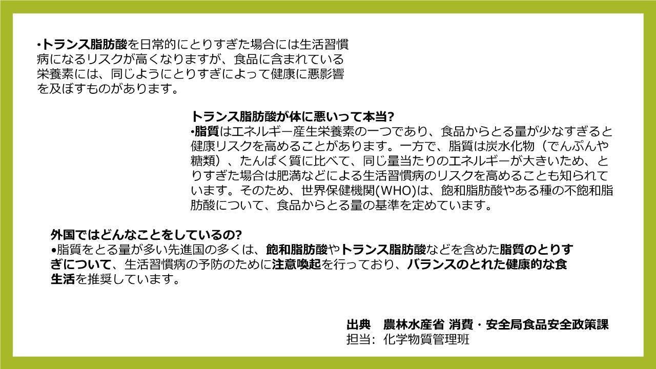 国際グローバル化が進んでいる中、アレルギーや発がん性物質など、食の安全性が求められています。日本では認可されていても、米国や台湾など海外の多くでは認可されていない食材がたくさんあります。(トランス脂肪酸含有のマーガリンやショートニング等々。)