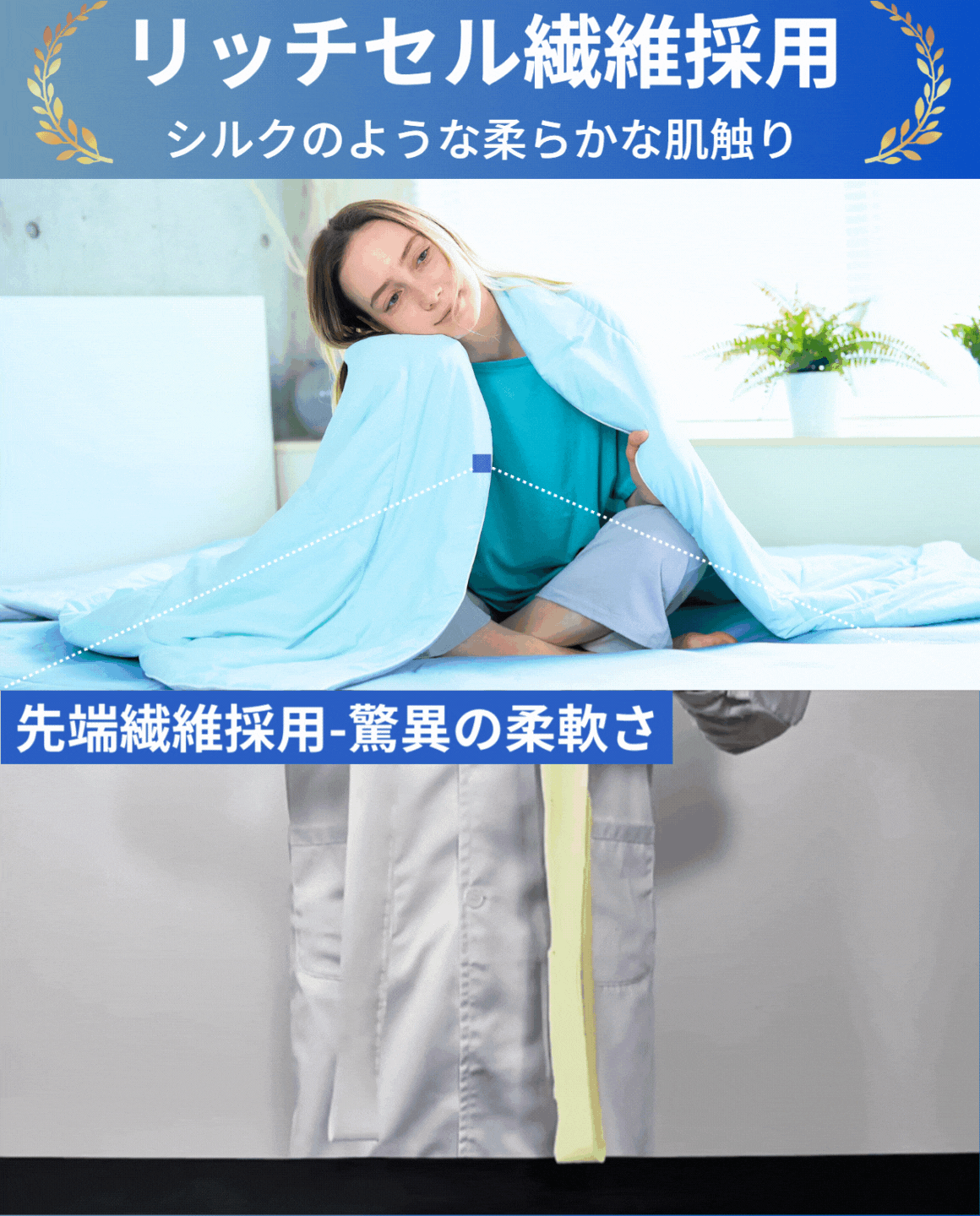 さらに最先端なRichcel(リッチセル)繊維採用したことで、清涼感あふれるひんやりタッチ、シルクを超える柔らかさ、高級感のある贅沢な布団に仕上げました。