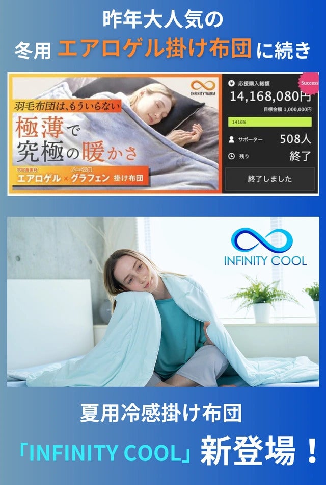 この夏、さらなる快適な睡眠体験を届けるべく、最先端テクノロジーを採用した冷感掛け布団「INFINITY COOL」プロジェクト始動!これまでのエアシリーズと同様に、最先端な素材を採用し、高機能と心地よさを兼ね備えた1枚となっております。支援者の皆様に、これまで以上に素晴らしい睡眠体験をお届けできることを願っております。