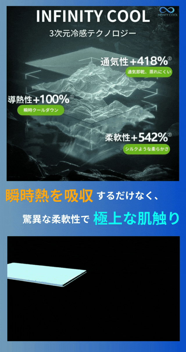 冷感掛け布団「INFINITY COOL」は3次元冷感テクノロジーで、体の熱を吸収だけでなく、さらに驚異な通気性で熱を放出し、ひんやりとした気持ちで朝まで快適に!