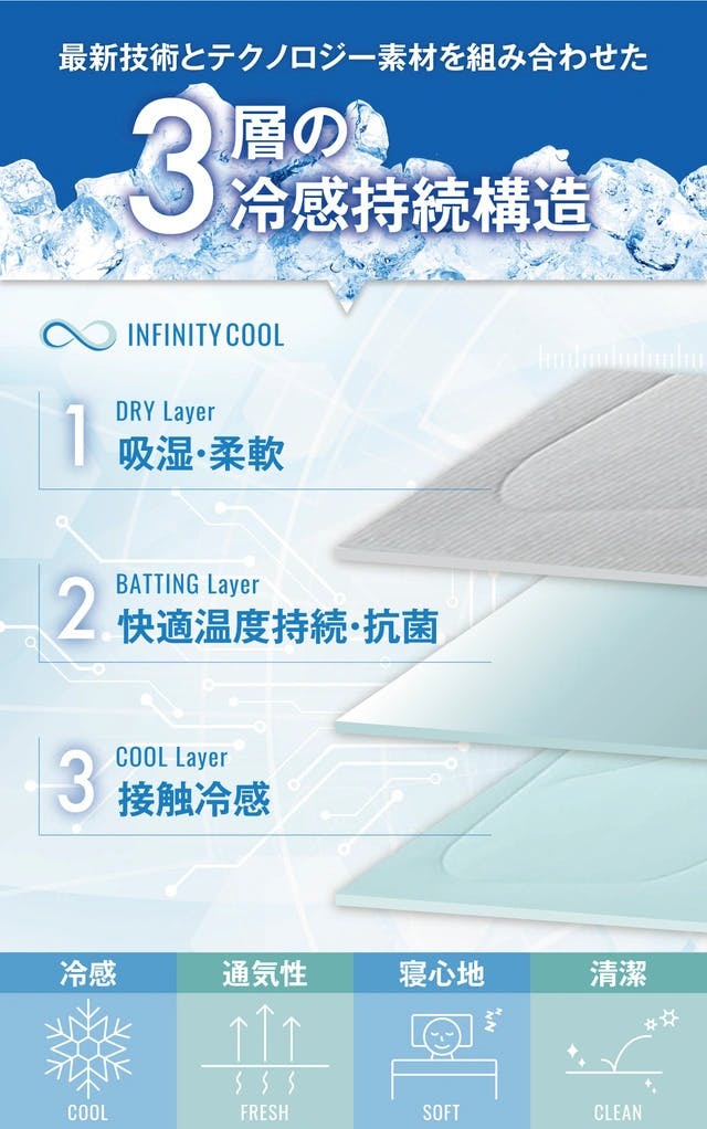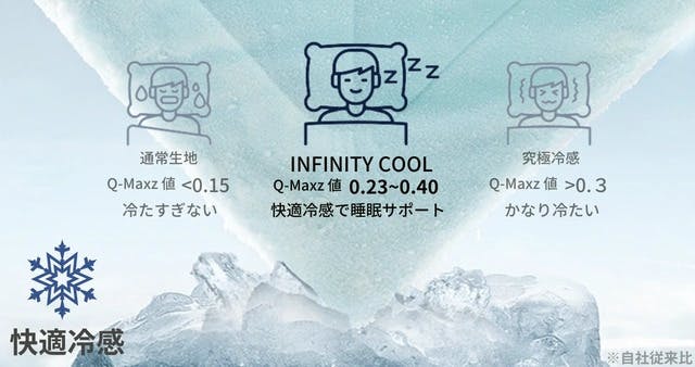 「朝まで続く快適冷感」、「爽快な寝心地」、「お手入れの簡単さ」の3大要素がそろった冷感掛け布団「INFINITY COOL」で、理想な睡眠体験を〜