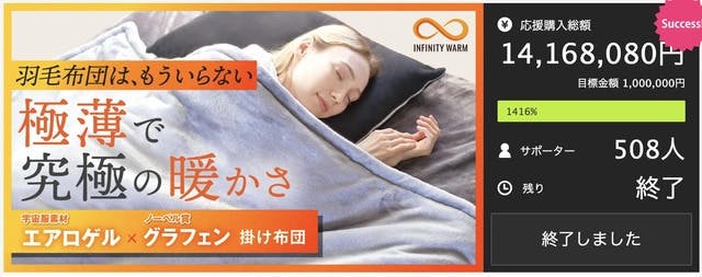 これまでは宇宙服素材のエアロゲルシリーズで、多くの支持を集め、累計1.4億円*以上の金額を達成。昨年は、エアロゲル素材を使用したオールインワン掛け布団「INFINITY WARM」が大人気で、1,400万円以上の支援を集めました。(*自社EC販売などを含む)