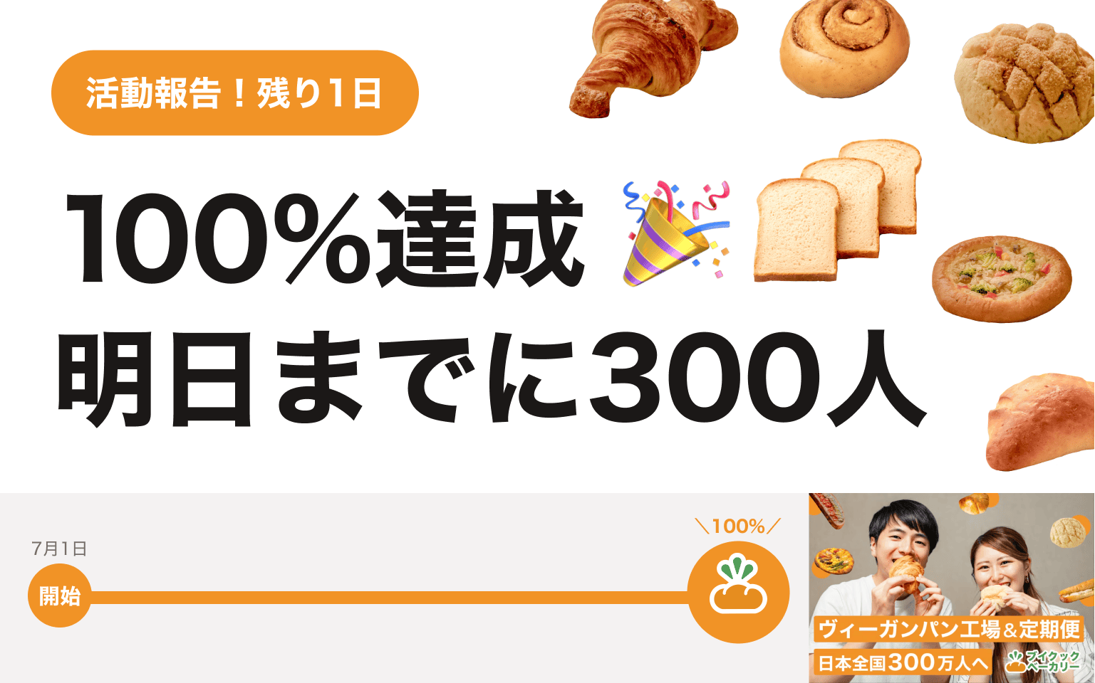 2023/07/22 22:59夜遅くに申し訳ありません。ブイクックの工藤柊です!応援してくださる皆様にお伝えすなければと、活動報告を緊急で書いています。なんと、100%達成しました...!!!ご支援いただいた皆様、SNSシェアいただいた皆様に、改めて感謝です。ひとまず、一安心しています。ヴィーガンパンを日常にするために、こんなにも多くの方に共感・支援いただけて、本当にありがたいです。明日23:59までに、300人を目指して。そして、今回のクラウドファンディングの本来の目標である、「ヴィーガンパンを300人に届けること」を目指して、明日の23:59まで頑張り続けます!のこり15人に支援いただけるよう発信など頑張り続けていきます。最後まで、ご協力よろしくお願いします!(明日は、ビーガングルメ祭りにも出店していますので、もし見かけることがあればお声がけいただけると嬉しいです。) もっと見る