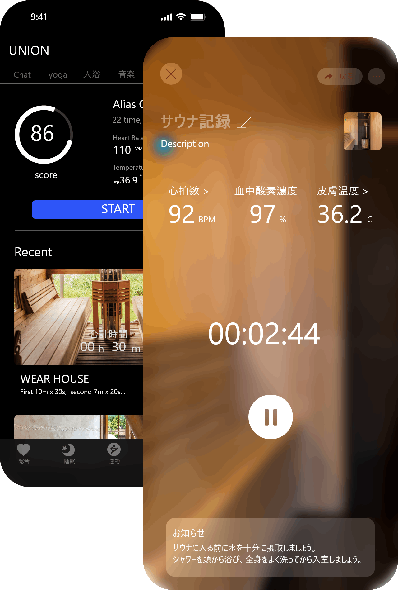 iREOでは、温度、湿度、個人メモなど、サウナ体験を記録・追跡することができます。サウナや冷水浴中の体の反応を分析することで、最適な浴び方と時間を提案し、最高の結果を得られるようサポートします。