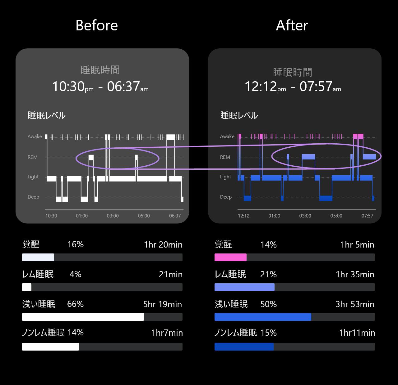 睡眠改善コンテンツを継続的にご利用後、同じ睡眠時間でも睡眠の質に改善があるのが確認できます※。非常に少なかったレム睡眠時間が改善され、全体の睡眠レベルのバランスが良くなっています。