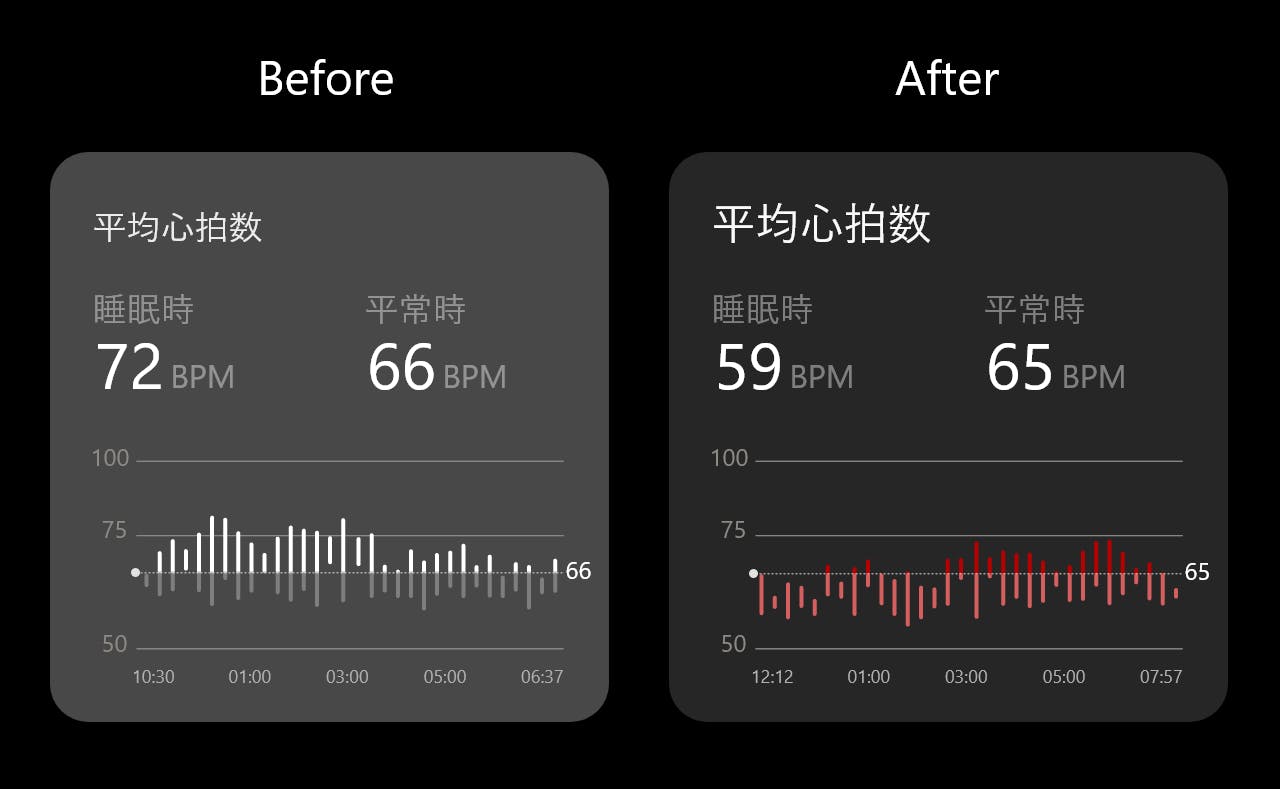 また、睡眠時の心拍数も減少し、リラックスした睡眠へ改善されています。