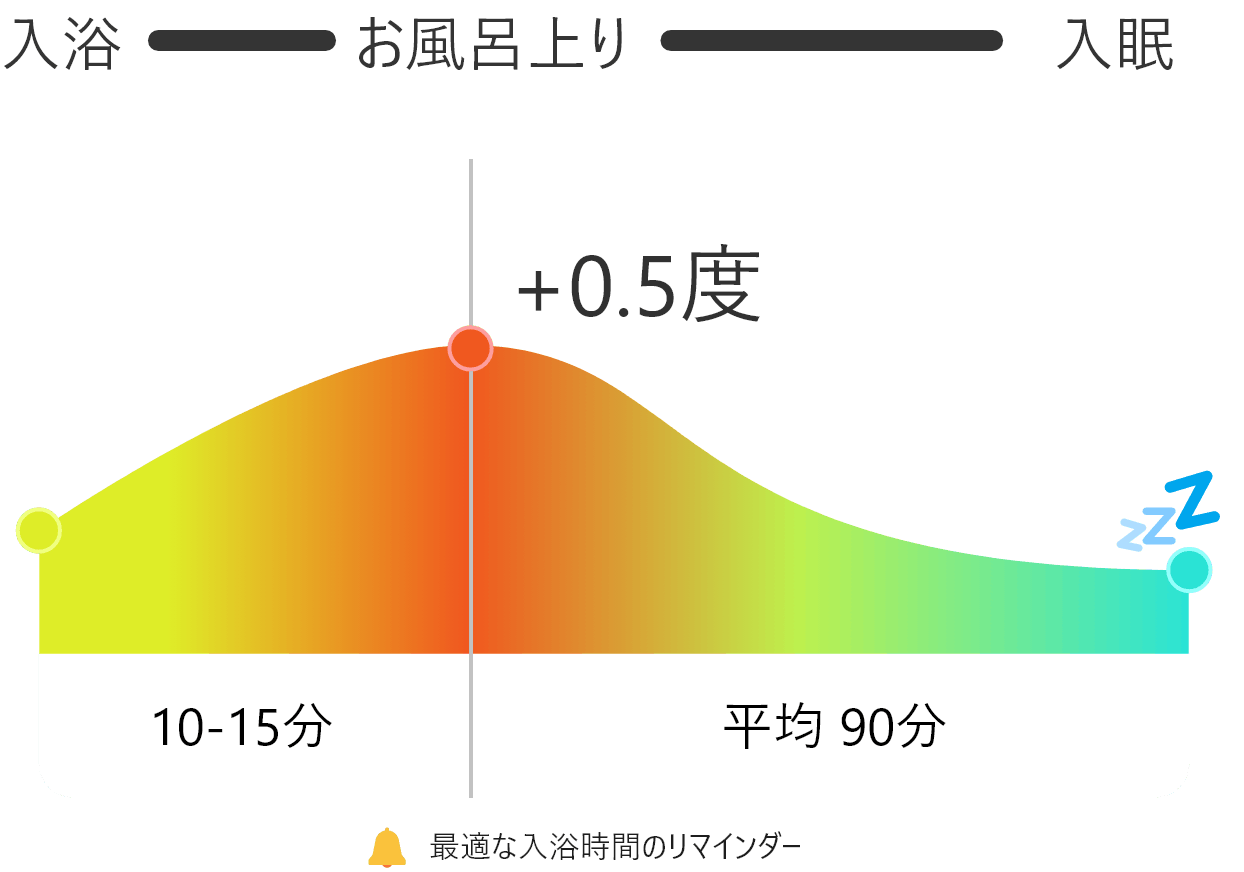 入浴は一時的に体温を上げ、その上昇した体温が放熱される際に、人体は自然と眠気を感じます。ただ、この過程は個人差がある為、iREOより取得した生体データを解析し最適な入浴時間についてアドバイスを提供します。