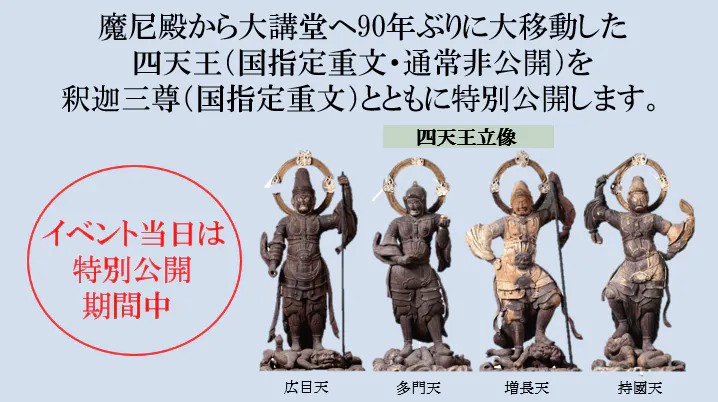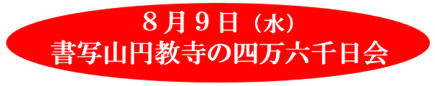書写山円教寺の四万六千日大祭はこの日に観音様にお参りすると、四万六千日間続けてお詣りをしたのと同じ功徳が授かるといわれ、観音様と特別なご縁を結べる日「観音功徳日」とされています。