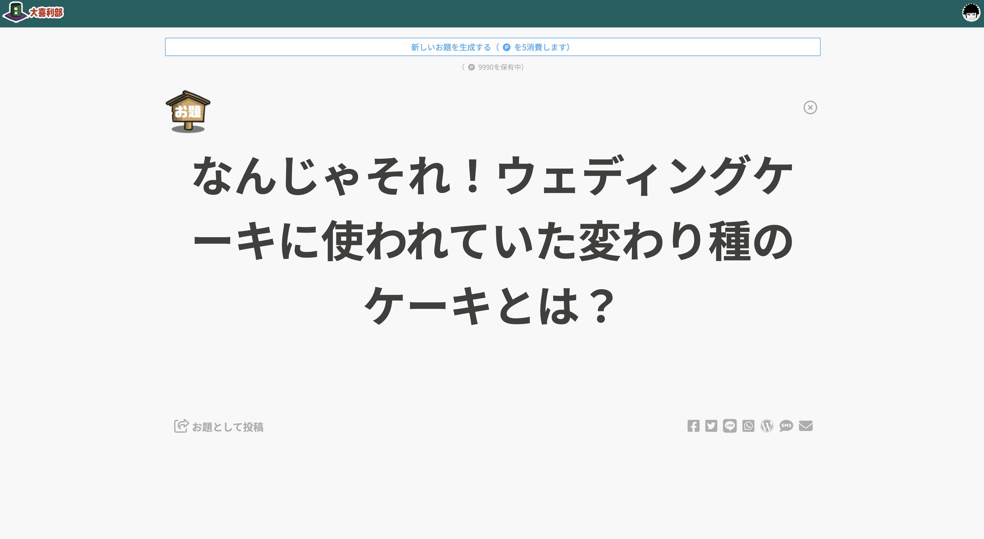 生成したお題は、サービスのお題として投稿もできますし、SNSに投稿したり、オフラインで大喜利するときなどにも利用して欲しい機能です。(画像お題の生成、音読してくれるような機能も将来的にはつけたい)