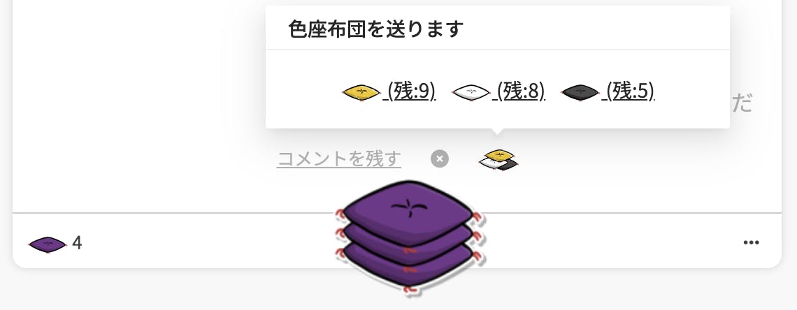 この色座布団により、特に面白かったよという表現が可能になっています。しかし色座布団は保有している枚数分しか付与することはできない貴重なものです。付与した人に対して特別感も演出できる仕様となっています。