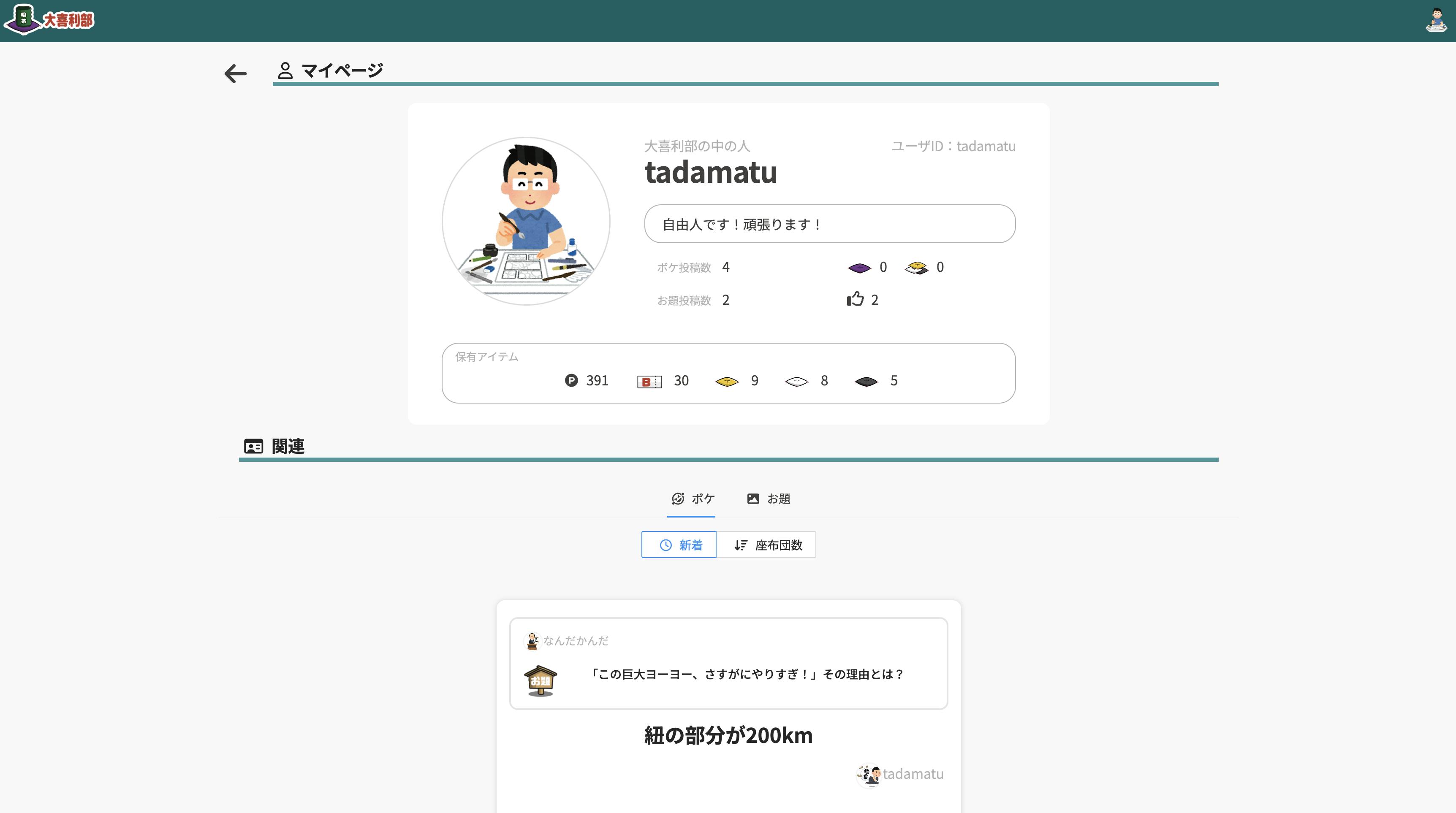 自分(他のユーザ)の情報や提出したボケ、お題を参照できるページです。