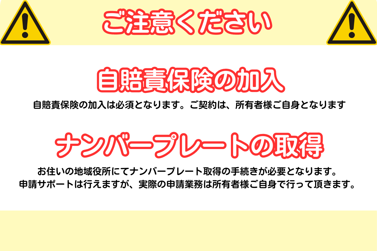 2.公道を走行する場合自賠責保険への加入が必須です。(加入せずに運転すると処罰の対象となります。)