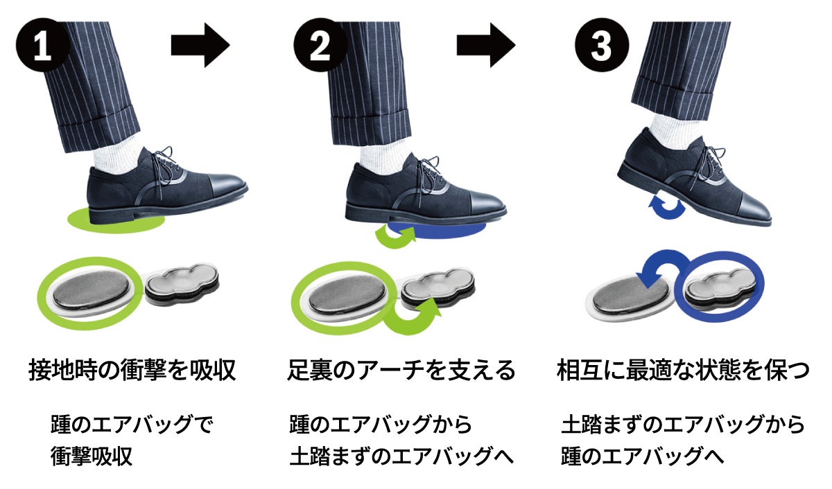 デュアルエアバッグは歩行時に空気が移動し、常に適切な空気圧バランスを生み出します。結果、日常の動作において効率よく衝撃吸収をしてくれるということです。人は、単純に歩行するだけでも、実は足には体重の何倍もの衝撃が加わっています。インソールの性能の良し悪しによって、身体にかかる負担は思っているよりも大きく変わるのです。