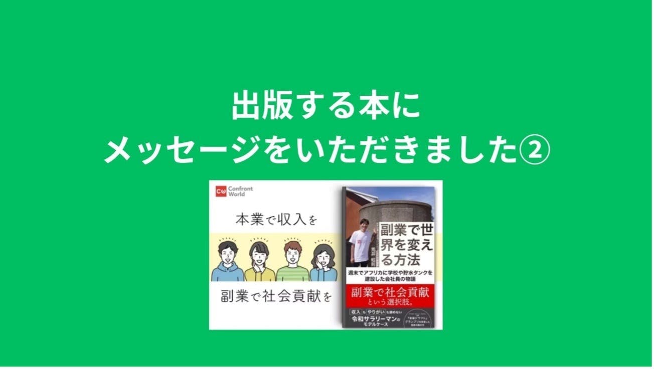 2023/08/27 09:48今回も、様々な方々からメッセージをいただきましたのでご紹介いたします!これらのメッセージは、本の中のどこかにも掲載されております!ぜひ購入いただき、探していただきたいです!!出版する本へのメッセージ⑥株式会社マザーハウス代表取締役副社長 山崎 大祐 様==================荒井さんの素晴らしさは、肩書とか副業とか、カッコいい響きと正反対にある、もがきや必死さにあります。だからこそ学びがあるし、遣り甲斐がある。そんなモデルケースの荒井さんを是非応援してほしいです。==================出版する本へのメッセージ⑦認定NPO法人あおぞら理事長 葉田 甲太 様==================荒井くんは、自分のふがいない部分に向き合いながら、仲間とこれまで助け合いながら来たからこそ、人の痛みが分かるんだと思います。だからこそ、諦めないから、この本を書いたのだと思う。==================国際教育支援NPO e-Education創業者 税所篤快 様==================あらいさんと仲間たちの挑戦を応援します!!!==================NPO法人HERO代表 橋本博司 様====================================僕はカンボジアで学校建設や医療支援をしているNPOを”本業”として運営しています。荒井さんに会うといつも楽しそうに、会社員の仕事とコンフロントワールドの仕事の話をしてくれます。2つの立場からいつも考えているので、見えている視座が普通の会社員ともNPOとも異なっていてとにかく話が面白い!もちろん、頭の中がぐっちゃぐちゃになることも多いと思うし、文章に書いてあるように人気関係のトラブルなど大変なことも増えてしまいます。それでもこの”副業”として社会貢献に取り組むことはメリットの方が大きいと感じます。お試し的にも取り組めると思うので、この本をきっかけに”副業”社会貢献活動家がどんどん生まれてくることを期待しています!==================みなさま本当に本当にメッセージありがとうございます!実はメッセージを依頼する連絡も、「しても良いのかな?」「どうしようかな?」と一週間以上迷っていました。勇気をもってメッセージを送ってみたら、みなさまが全員快く引き受けてくださり、お忙しい中応援メッセージを送ってくれました。本当に本当にありがとうございます!!! もっと見る