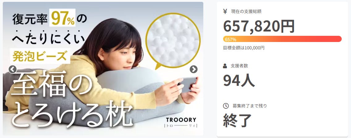 2024/07/01 10:00こんにちは、市場株式会社です!至福のとろけまくらTROOORYプロジェクトは昨日(6/30)終了し、目標金額の657%を達成いたしました!ご支援いただいたみなさま、誠にありがとうございます。商品発送に向けて準備を進めて参りますので、到着まで今しばらくお待ちいただければと思います♪ もっと見る[目標達成率500%越え!]TROOORYプロジェクト残り10日!