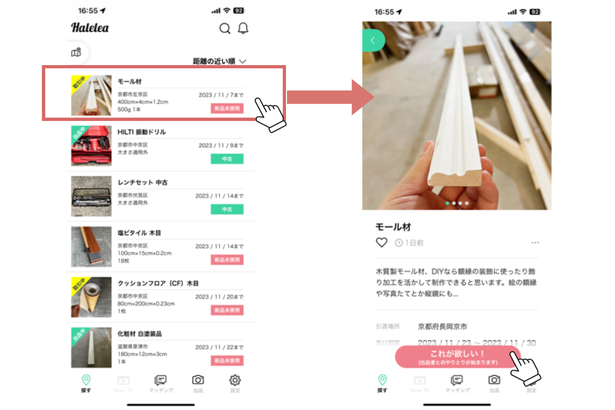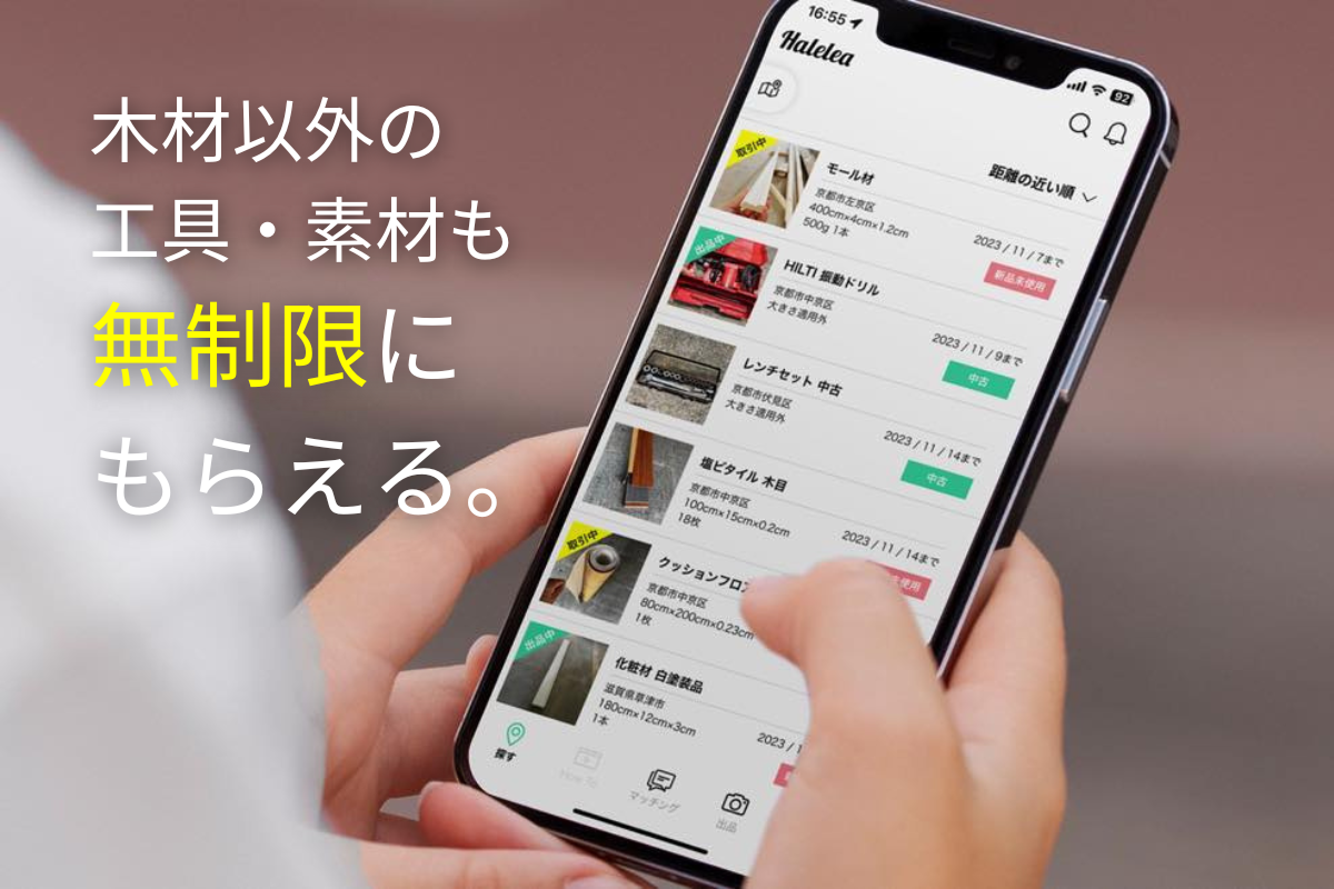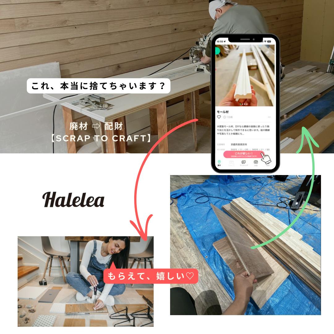 建築業界での常識となっていることだとはいえ、私は25年間この廃材や残材を処分していることについてモヤモヤし、心を痛めていました。こういった経緯からこの度「建築業界の常識を書き換え、問題を解決するアプローチ」として、「Halelea(ハレレア)」というアプリを開発しました。このアプリには、建築現場で使いきれなかった「廃材や資材」をDIY好きな方々、木工職人の方々などに無制限でお譲りできる仕組みがあります。