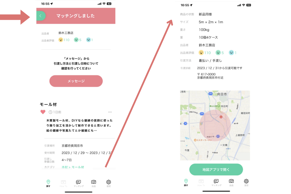全国各地の工務店が建築現場で出た廃材などをアプリに登録!「距離の近い順」などの絞り込みもでき、簡単に検索!