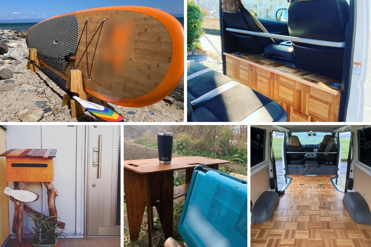建築系の知識は全くなく、一から独学で作ってます。DIYはキャンプやSUP、カヌーなどの趣味を通じて自然に興味を持ったのがきっかけで始めました。自分で道具を作ってみたいと思うようになったからです。作品は、主に棚やテーブル等が多いですが、過去にはポストや車の内装も加工しました。今までたくさん失敗作品を製作しましたが、友達に頼まれてプレゼントしたりして、15点程は使用できているかなって感じです。