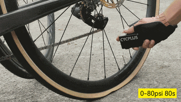 高トルクのブラシレスモーターが採用されており、700×25Cのロードバイク用タイヤを0 PSIから80PSIまで(5.12barまで)わずか80秒でスピーディーに空気入れ。
