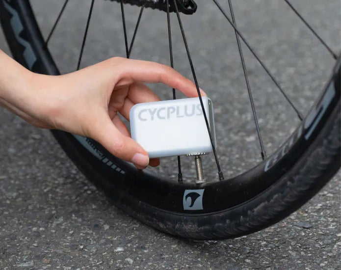 ①「CYCPLUS CUBE」のバルブをタイヤのエアバルブに差し込む。