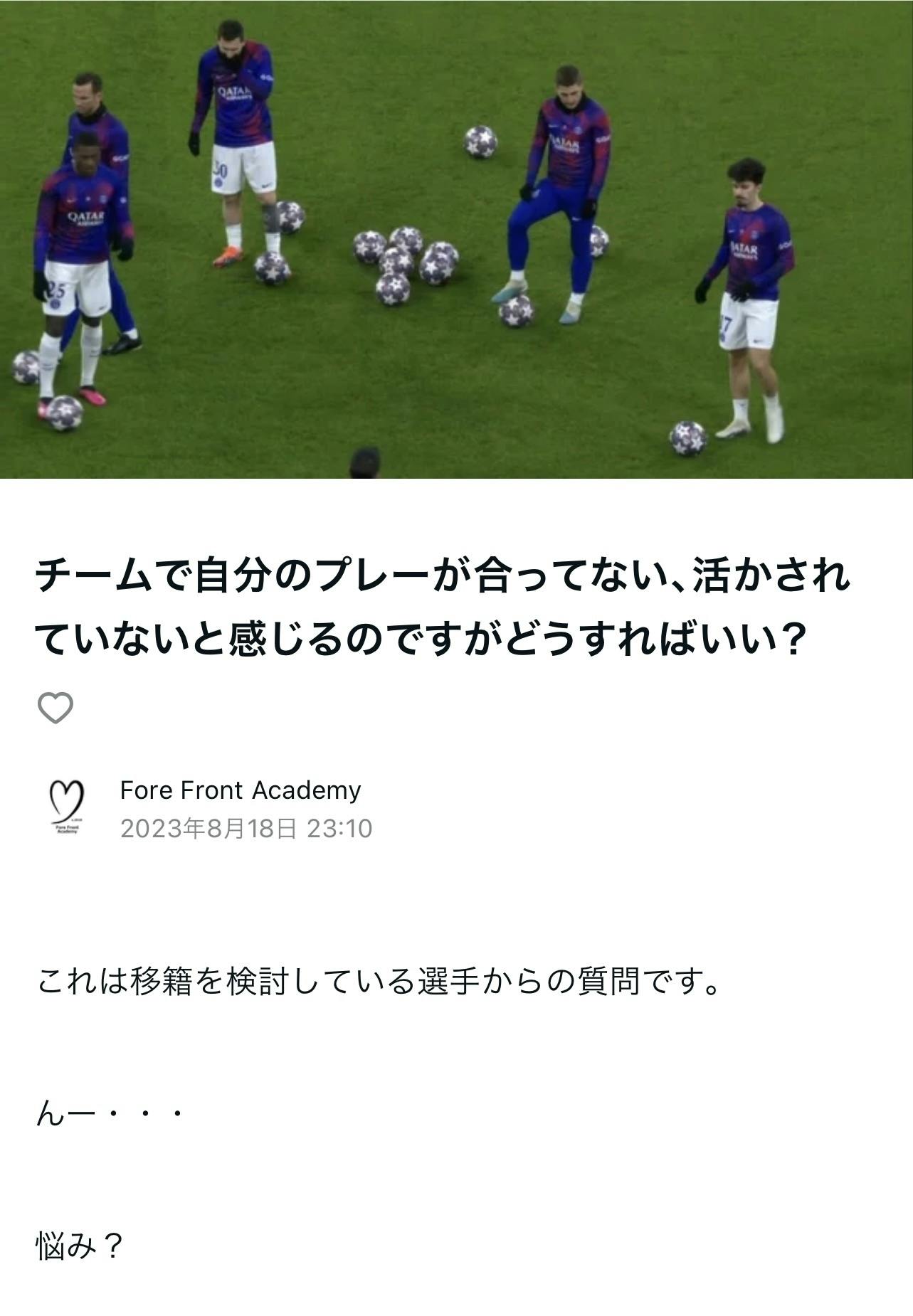 2023/08/20 00:53FFA noteを更新しました。https://note.com/ffa※URLはプロフィールに貼り付けています今回のテーマは・チームで自分のプレーが合っていな、活かされていないと感じるのですがどうすればいいですか?これはとても良い質問です。自分の不安や迷いについて考えること。こんな時にFFA methodを読んで欲しいと思います。FFAが考える解決策を是非noteで読んでください!FFA methodを皆様の思いで広げて頂けますようクラウドファンディングのご支援、宜しくお願い致します。 もっと見る