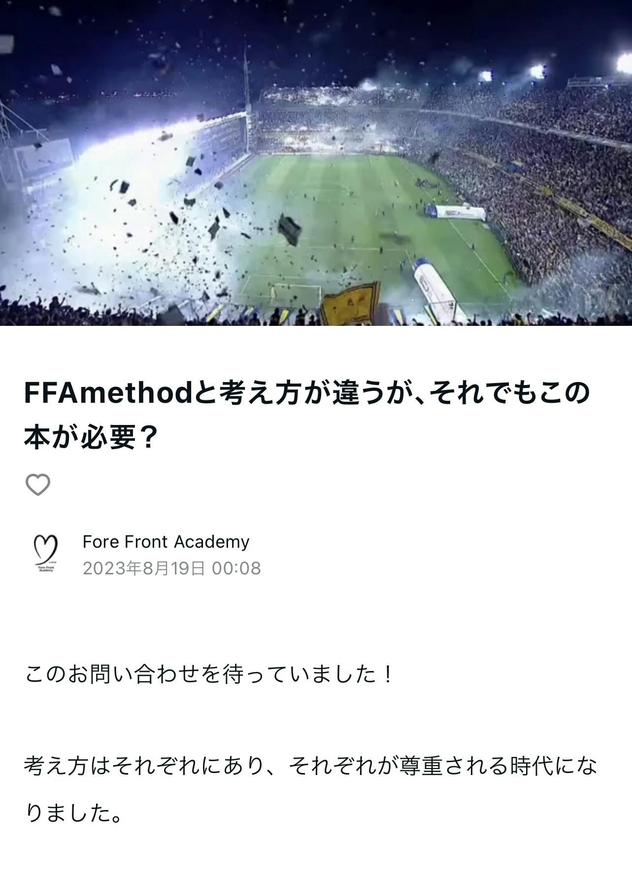 2023/08/20 00:59ここまでクラウドファンディングで公開したFFA methodに多くの皆様からの応援とご支援を頂きありがとうございます。今回のクラウドファンディングの最終日となりました!期待と不安で始めた今回のプロジェクト。SNSや現場を通じこれまで以上に多くの方々と繋がることができました。多くのご質問とお問い合わせからFFA methodについてnoteを通じお答えする過程で私自身もFFA methodを振り返ることができたことで、現在FFA methodの制作の修正と調整を行なっています。振り返ることで感じたことは、サッカーを通じてもっと多くの方と繋がり良いものを一緒に作り上げることが出来ればと強く思いました。これからサッカー界は新しいフェーズに突入します。情報に溢れそれぞれの方向に進みやすい時代になります。そしてそれは一本道ではなく、いろんな道を自分で選んで進める時代になってきています。いろんな考え方を持ち優劣を付けずにそれぞれの可能性について感がてみる。仮説を立てる、想像してみる、いろんな未来を考えてみる。FFA methodはそんな考えるきっかけになる新しいタイプの本です。まだ悩まれている方や迷っておられる方は是非FFA methodで1歩を踏み出してください。そして一緒に考えましょう、次に待っているサッカーについて。最後になりますが、FFA methodの考え方や取り組みに共感して頂けましたら是非ご支援の程、宜しくお願い致します。https://note.com/ffa※URLはプロフィールに貼り付けていますhttps://camp-fire.jp/projects/view/682085※URLはプロフィールに貼り付けていますFFA methodを皆様の思いで広げて頂けますようクラウドファンディングのご支援、宜しくお願い致します。 もっと見る