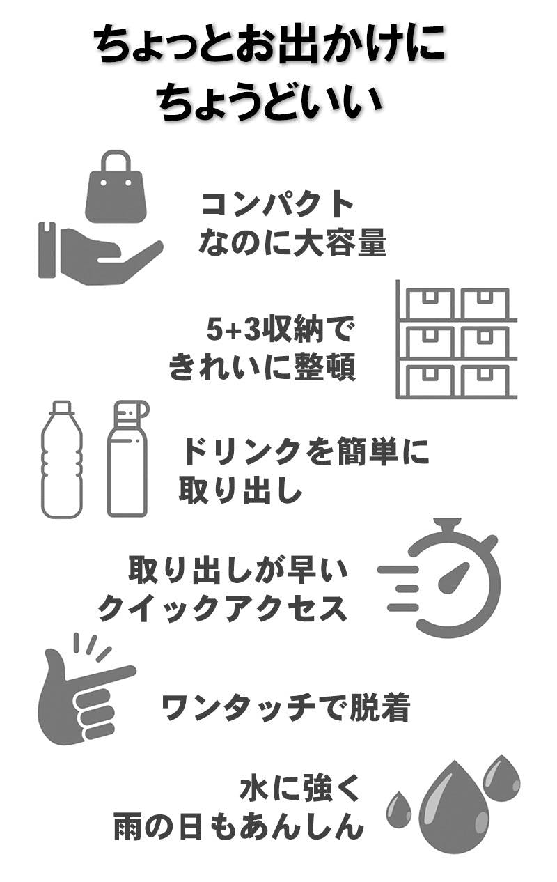 荷物があふれて手をふさいでしまうストレスをなくし、必要なものを、必要なだけ持ち歩く便利さを体験ください。