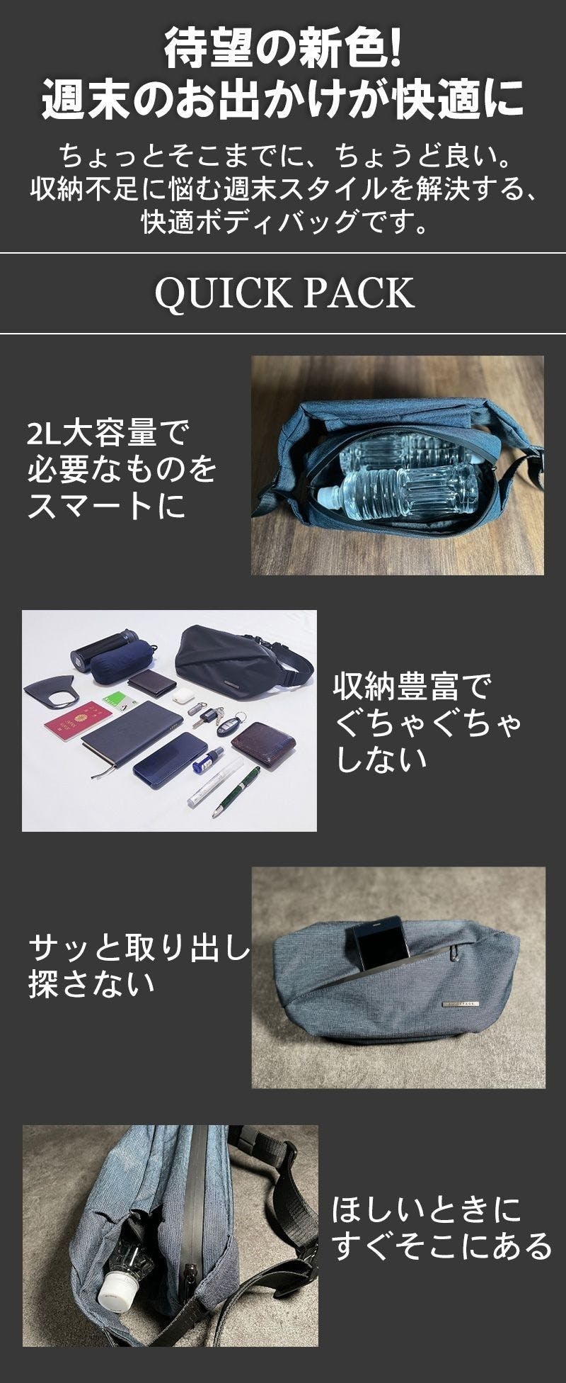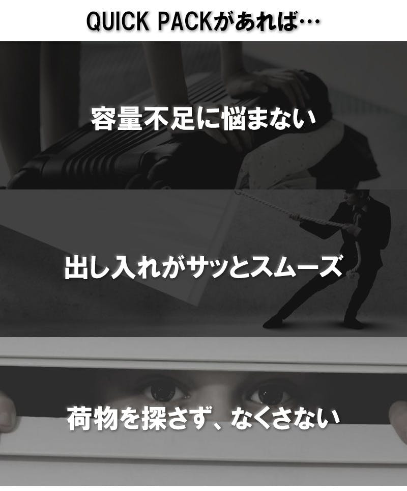 ご愛用者様からこんな声をいただいているQUICK PACKは、シンプルでコンパクトな見た目以上に、たっぷり収納するのが特徴です。