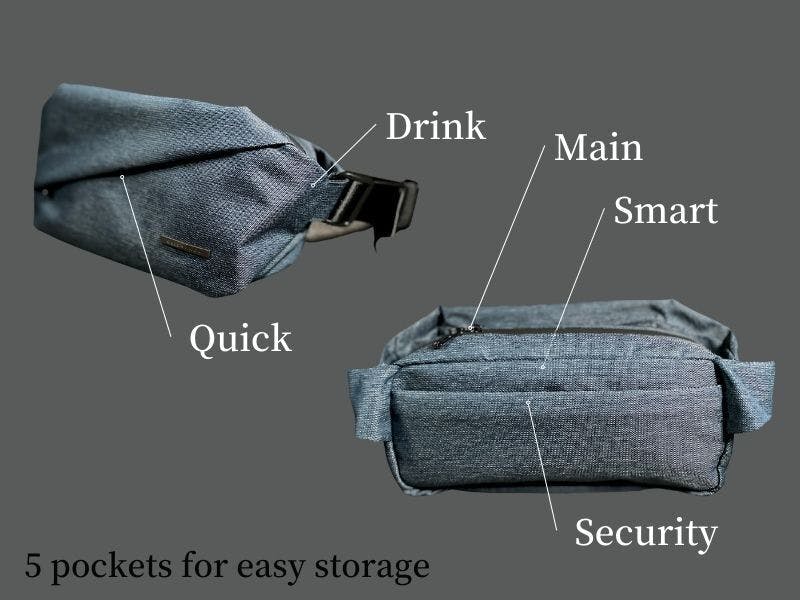 5つのポケットがあります。メインのポケットに加えて、4つの機能的なポケットで、スマホも、ドリンクもすっきり収納してサッと取り出せます。