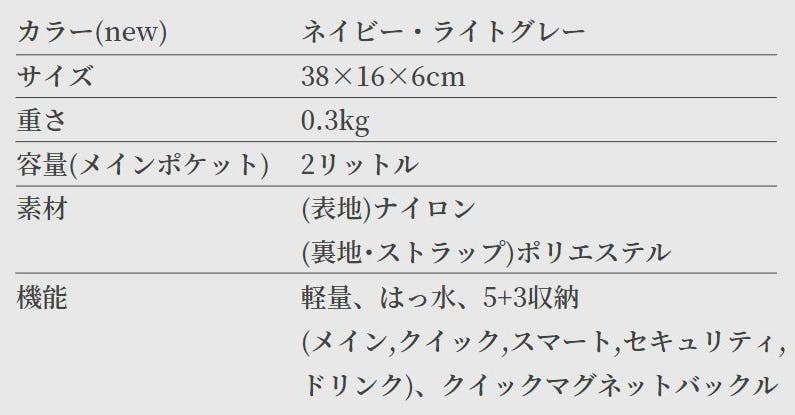 38×6×16cmで、ペットボトルからスマホ、パスポートまで入ります。