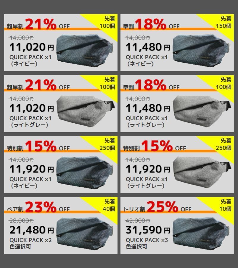 2026/03/27 12:30支援者のみなさまいつもプロジェクトの応援ありがとうございます。本日12時よりあなたのワークライフを快適にするボディバッグ「2サイズ同時の限定販売」が公開されました。【タブレット対応】QUICK PACK 11sは「大容量なコンパクトモデル」。普段タブレットや電子書籍とマイボトル程度で通勤される方に最適のサイズ。男性女性問わず“体にフィット”するサイズ感で、1,000名近い方にご愛用頂いています。一方、【A4/PC対応】QUICK PACK 15sはリュックは大きい、ショルダーでは小さい...そんなニーズに応える15インチサイズのワーカーズバッグ。ノートPCとA4の書類、充電器にマウスなど、ガジェットをまるっと持ち歩くことが多い方にピッタリ。どちらも斜め掛けでサッと掛けられ、荷物も入れやすい横長の形状。歩きや自転車での通勤にはもちろん、車や電車で荷物のつけ外しが多い方にも便利なバッグ。カジュアルすぎない、でもライトに使える。新しいバッグとフレッシュな気持ちで新年度を迎えてみませんか!?ぜひチェックしてみてください!>>【タブレット対応】QUICK PACK 11s>>【A4/PC対応】QUICK PACK 15s もっと見る