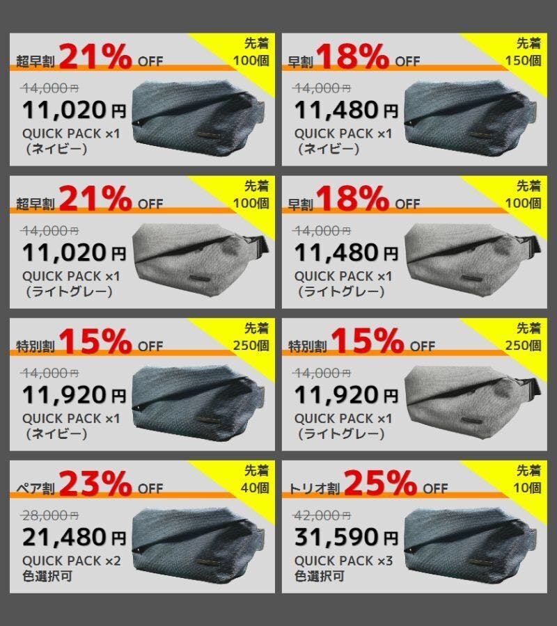 2025/04/14 15:00支援者のみなさまいつもプロジェクトを応援いただきありがとうございます。本日より新プロジェクトが公開となりましたので、ご連絡いたします。『通勤快適リュック【QUICK PACK officer】』が過去プロジェクトの好評をうけ、新プロジェクトとして本日公開しました!・ いちいちリュックを下ろさない。背負ったままスマホ出し入れが可能・ 7つのポケット+10のスペースで圧倒的な収納力・ 急な雨にも対応、レインカバー付属・ 立ち寄ったコンビニで買ったものはそのままコンビニポケットに皆さまの快適な通勤をサポートします!今回のプロジェクトでは 限定先着100名31%OFF、 リターン早期発送(6月)となります!お早めにご確認ください!!>>プロジェクトはこちら もっと見る
