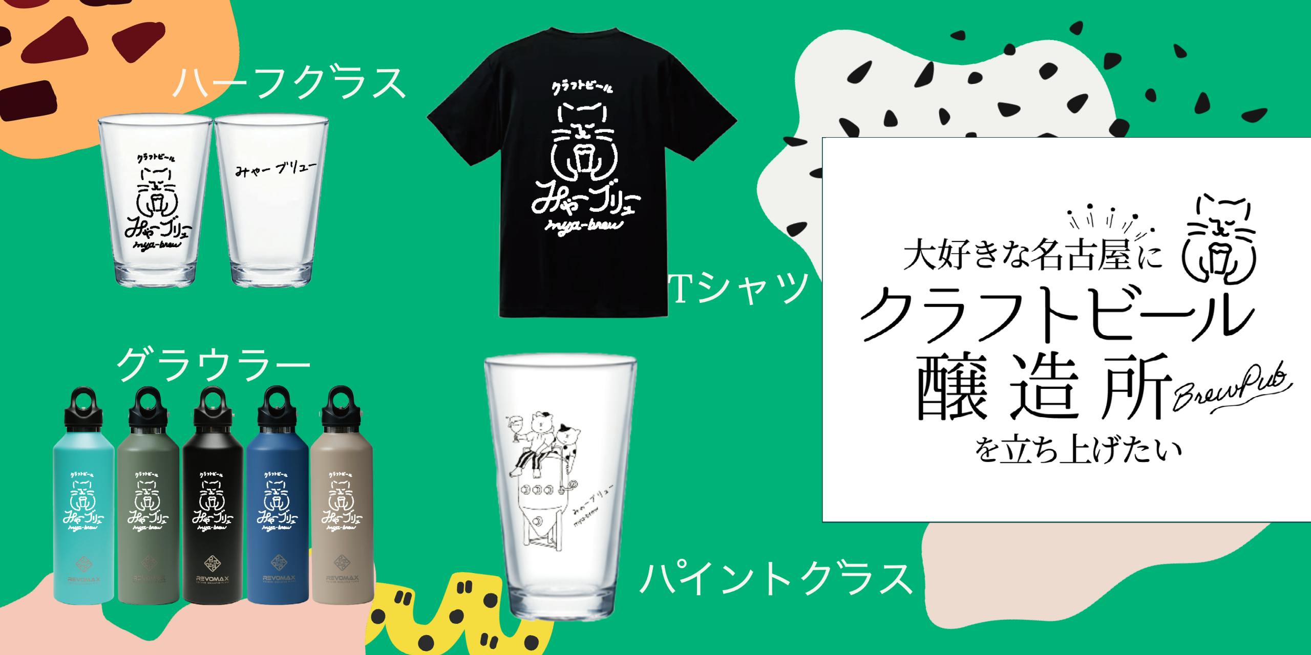 みゃーブリューでつくった瓶ビールをはじめ、みゃーブリューオリジナルグッズ(グラス、Tシャツ、グラウラー)をご用意しました。ご来店いただけない方や、自宅でも楽しみたい方、グッズを使用して宣伝応援してくださる方へ。