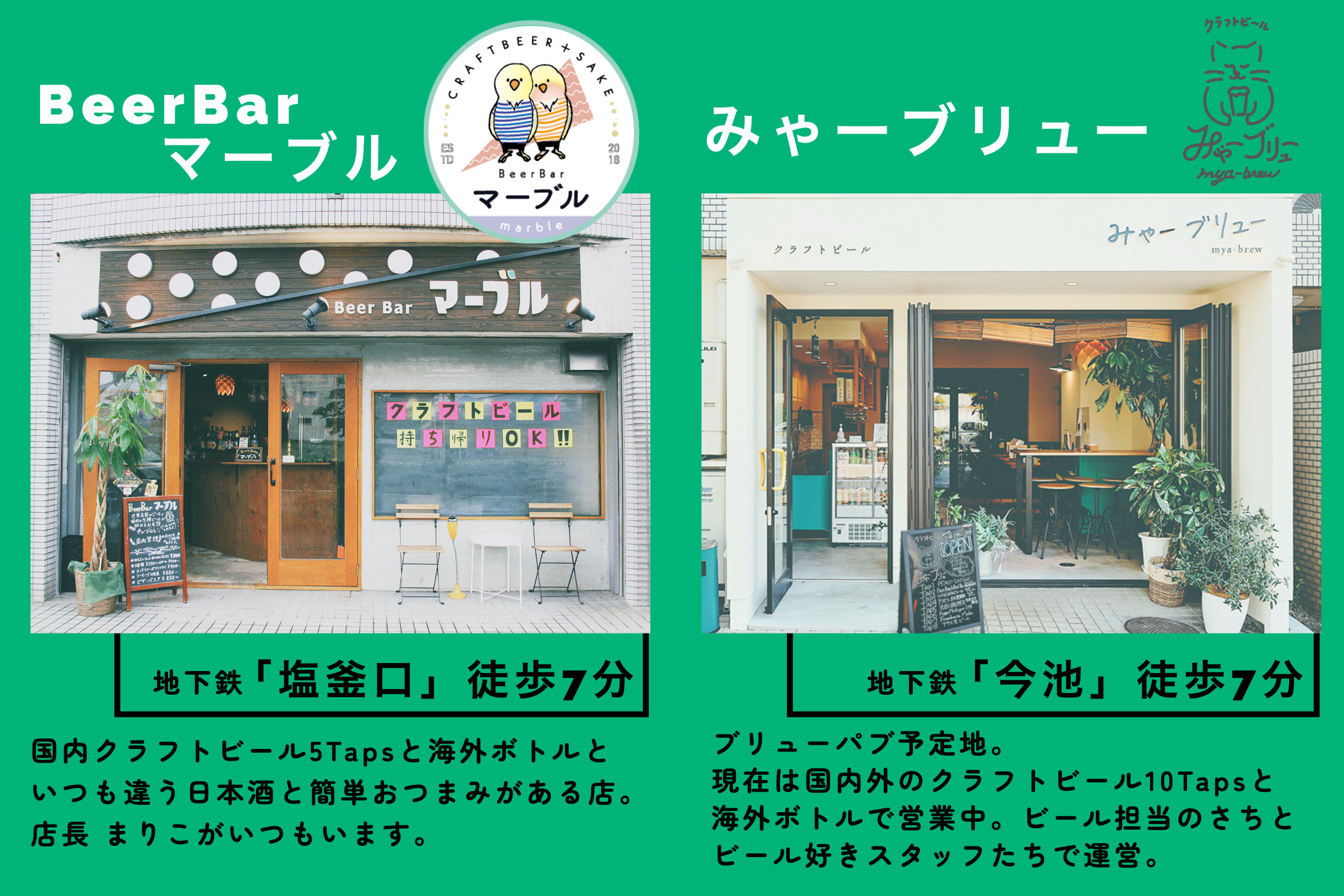 私たちは「クラフトビールでつながりを。一緒に新たなワクワクをうみだす」をビジョンに掲げ、名古屋市内に2店舗のビアバーを運営しております。2018年から1号店のBeerBarマーブル(以下マーブル) (名古屋市天白区:「塩釜口駅」徒歩7分)と、2021年から2号店のみゃーブリュー(名古屋市千種区:「今池駅」徒歩7分)です。みゃーブリューにて、醸造を予定しています。