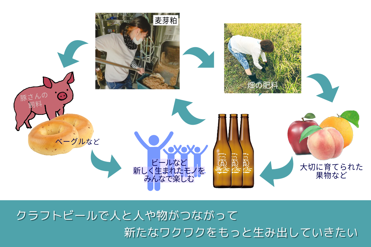 クラフトビールをつくる時に出てしまう麦芽粕を廃棄せずに、動物の飼料、畑の肥料にして農作物に生まれ変わったり、麦芽粕を原料に新たにパンを作っていただいたり。さらに大切に育てられた農作物を使ってまた私たちがクラフトビールを醸造させていただく。